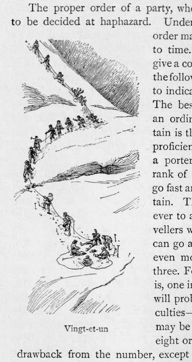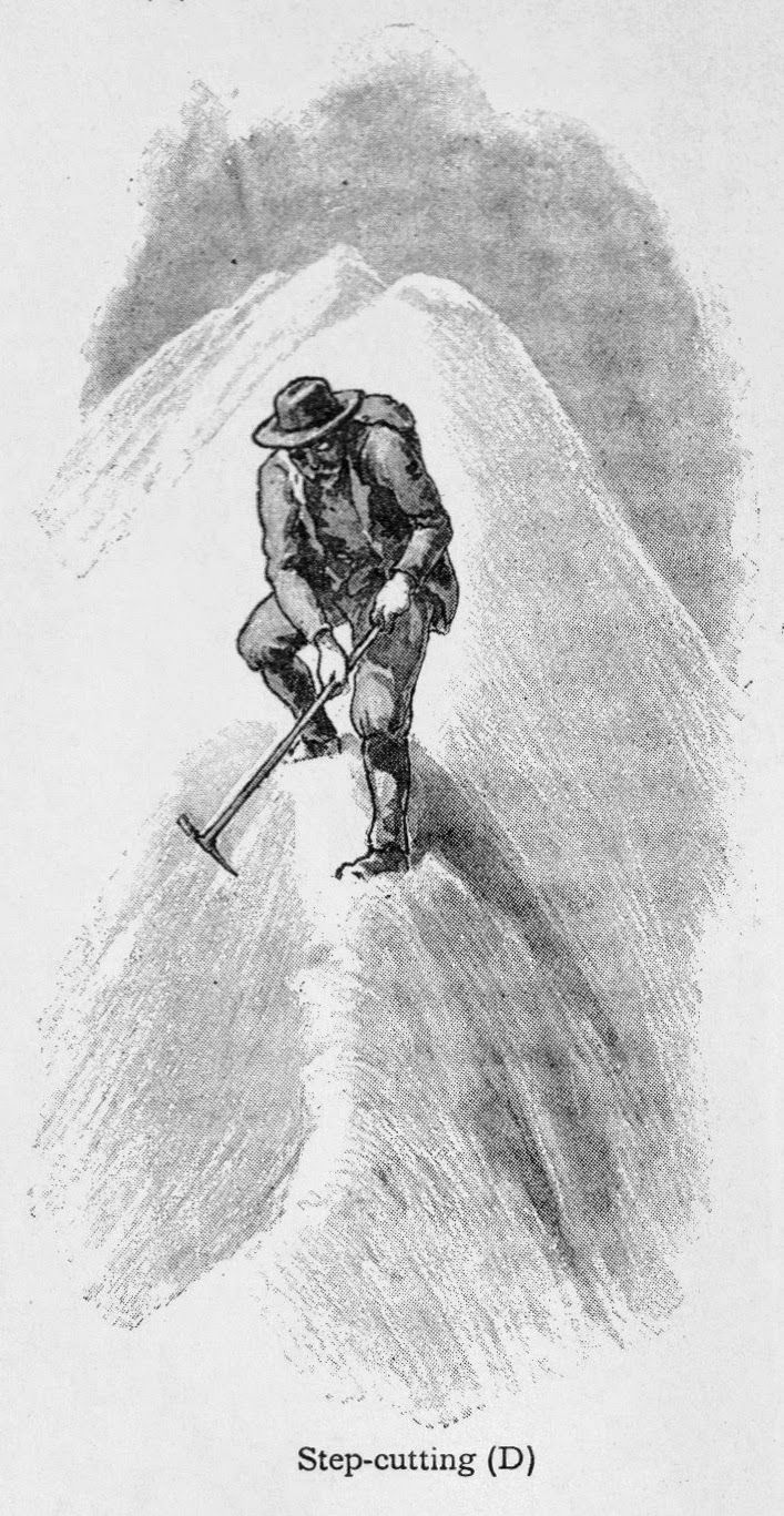 This book isn’t unique. It’s one of a number of guides that aim to be complete mountaineering manuals — the most famous is probably Mountain Craft by G.W. Young — but what sets Badminton apart is the charm and humour of the illustrations. The captions are frequently witty (or not so witty) puns. There’s a real sense that mountaineering is starting to find itself again as the 19th century draws to a close. After the 1865 Matterhorn disaster, and the first ascents of all the 4000m peaks were completed, Alpinism experienced something of a lull — but it didn’t take too many years for a new generation to burst upon the scene with enthusiasm and new ideas.