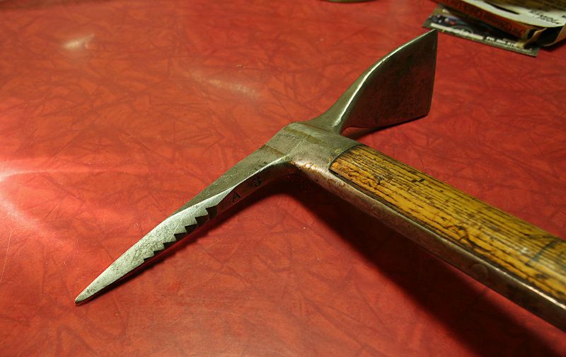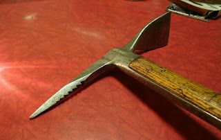 What fascinates me about climbing equipment is how attitudes to mountaineering have changed as the equipment has developed. This is a theme that I explore in The Only Genuine Jones. Jones was a man who operated at the leading edge of what was possible with the equipment of his day. An ice axe can tell you a lot about the man who wields it. The picture above tells me that Jones demanded a great deal from his equipment; he wanted an axe capable of the most precise step-cutting on steep ice, with aggressive teeth for the times when step-cutting wasn’t enough.