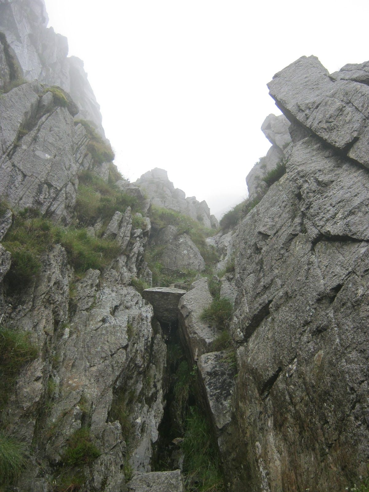 On Thursday I wanted to climb my North West Face so, despite the showers and low cloud, I set out with hope towards Cwm Idwal. When I got to the foot of the wall, however, it was abundantly clear that no amount of drying breezes in between the torrential showers would get the rock into climbable condition: it was just too wet. So, frustrated in my ambition, I took a short walk up the Sheep Walk terrace instead and explored the entrance to the enormous cleft of the Devil’s Kitchen.