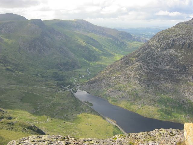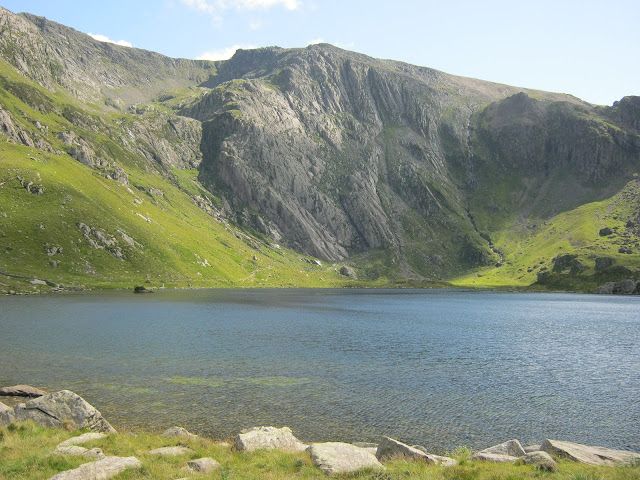 After a visit to the summit of Y Garn (an excellent viewpoint, and luckily with good weather that day) I speedily descended the NE Ridge and spent a while lying on the warm grass by the side of Llyn Idwal. This glacial hollow is a grim place on cold days, surrounded by sheer cliffs and fearsome torrents, but on a sunny afternoon it’s a splendid place to relax and unwind.