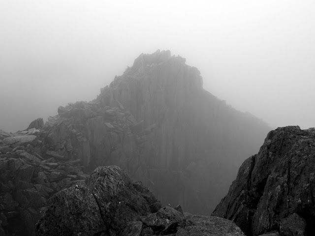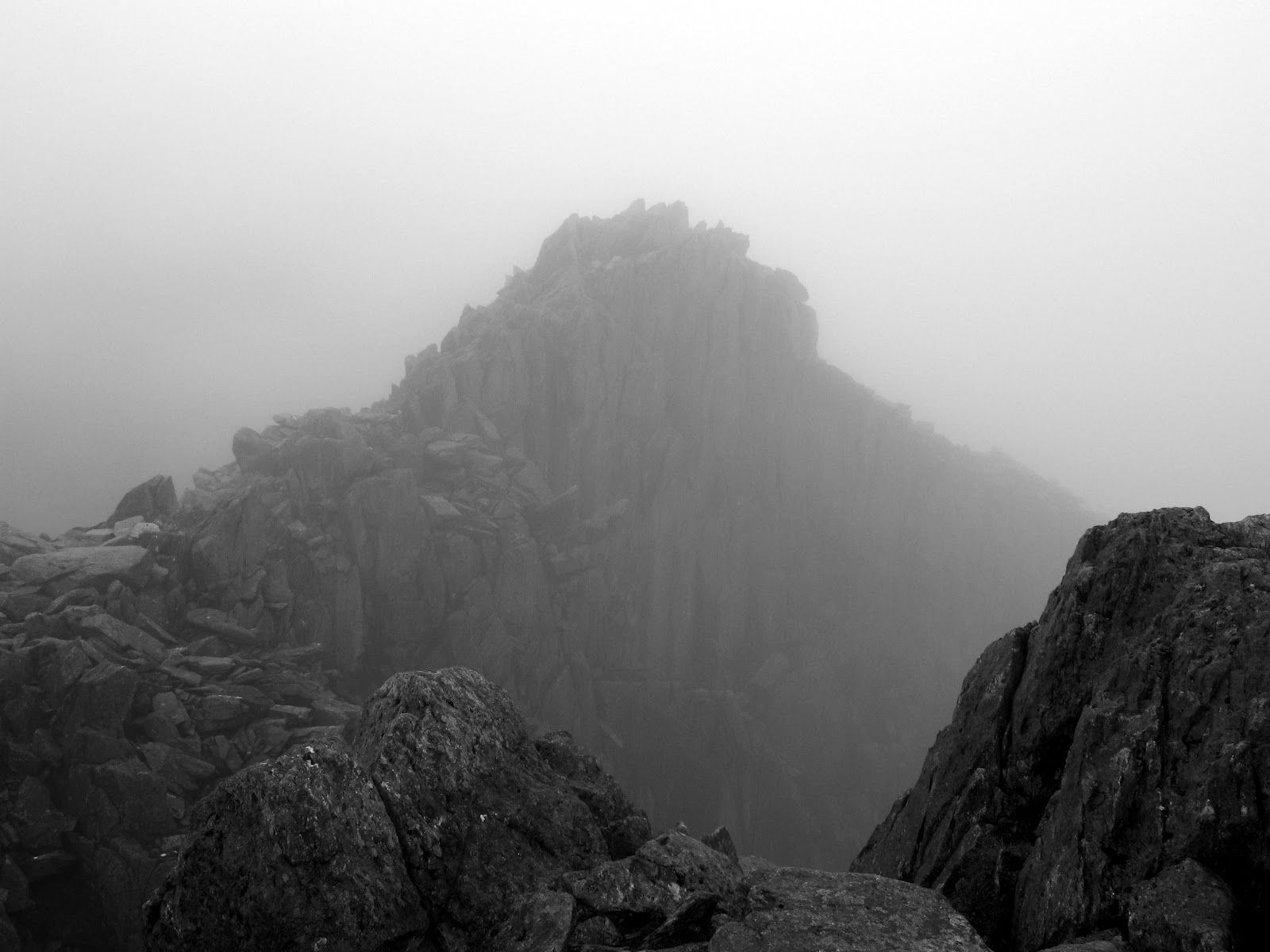 After visiting the summit (a bleak and cheerless place, that day) I descended the South Ridge of Tryfan and then ascended Bristly Ridge to Glyder Fach’s summit. Bristly Ridge is another old favourite. It’s still an ‘Easy’, but a notch harder than Tryfan with a few distinctly harder sections: Sinister Gully, and the direct pitch out of Great Pinnacle Gap. Although there are easier ways round, these direct variations might qualify as Moderate on some Scottish routes I’ve done.