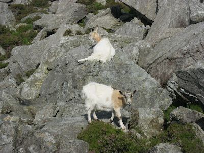 The start to the North Ridge scramble is very familiar to me now, and as I clambered up the broken rocks of the approach I spied a few young goats playing and munching the heather. They seemed quite tame and were content to watch me placidly while I recorded their antics with my camera.