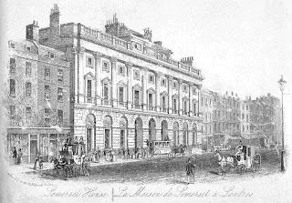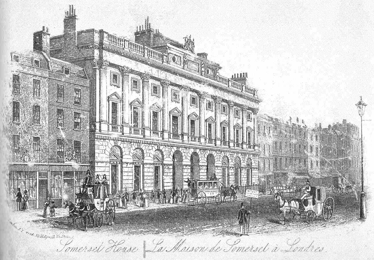 | Somerset House, Strand, in the 1840s. The action begins in the street near this spot on Christmas Eve, 1847. |