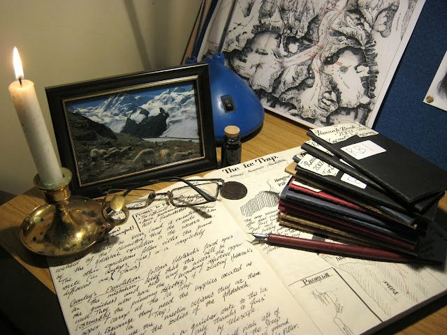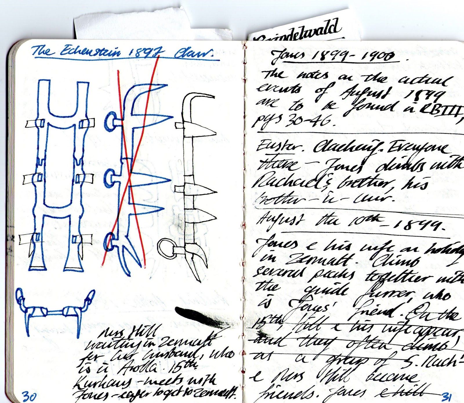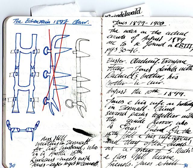 | Notes taken in 2010 during my trip to Grindelwald. Left is a sketch for the 1897 Eckenstein ice claw; right are some of my initial ideas for a future novel. |