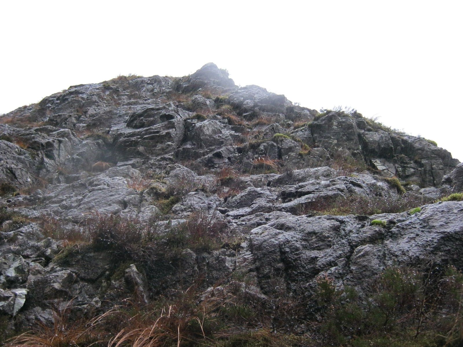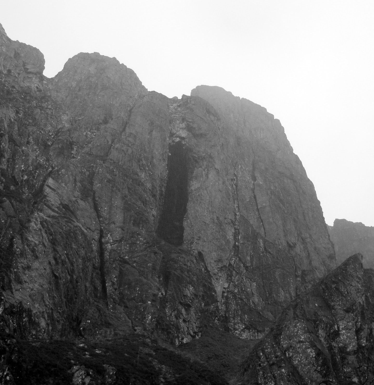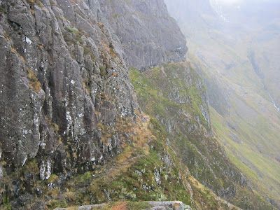 I expected to be sheltered from the rain, but in fact the undercut rock architecture of the Middle Tier produced endless waterfalls that cascaded over the narrow gangway. I got utterly drenched–far more so than I would have done through the rain alone! There was very little scrambling on the first part of the route. Mostly exposed walking, but nevertheless I was glad to have a stick for balance. I’ve discovered that something pointy (an ice axe, or stick with a steel spike at least) is recommended for many of the more overgrown routes on Aonach Dubh.