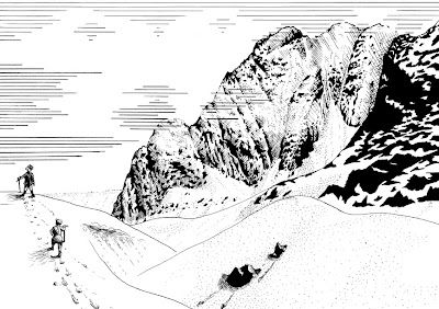 As we dropped down the hill and veered right once again, the precipices began to come into view, one by one, laced with ice and shining in the blue sky: Castle Ridge, the Castle, then the great overhanging buttress coming down from Carn Dearg; finally Tower Ridge and the NE Buttress. MacDonald, now overcome by his fears, declared that he would go no further. He dumped our supplies in the bog and fled.