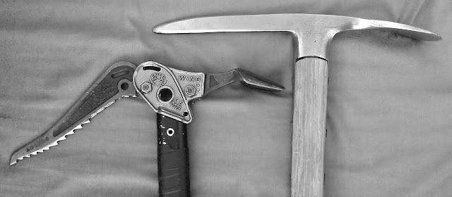| Comparison between the Grivel “Alp Wing” ice axe (c.2009) and Stubai Aschenbrenner. One is designed for front-pointing ascents, the other cutting steps. |