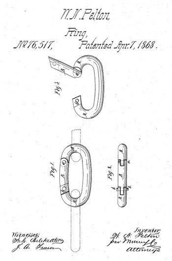 However, I have done nothing historically impossible. Karabiners did in fact exist in 1897; they were patented in 1868 by a Mr Pelton (see diagram). Crampons had been used for many years by climbers and the addition of front points was a minor innovation that may have happened at any time under the right conditions. Even pitons had been used by climbers in various forms since at least the 1860s.