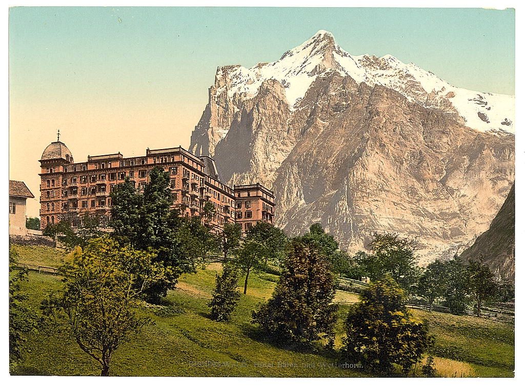 I spent an entire day searching for the Bear Hotel before concluding that it no longer existed. A sports centre now stands on the promontory of land once occupied by the hotel. Unable to investigate the hotel in real life, I did my best with books and some old colour postcards of Grindelwald from the 1890s.