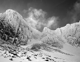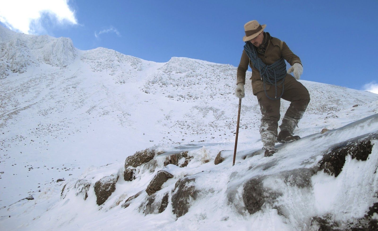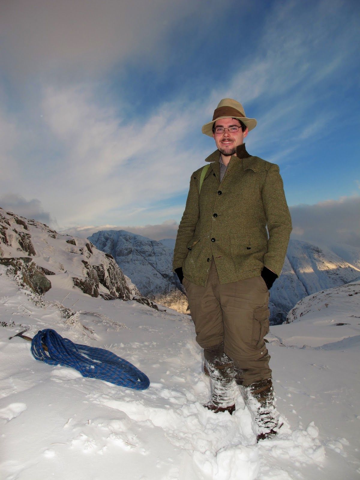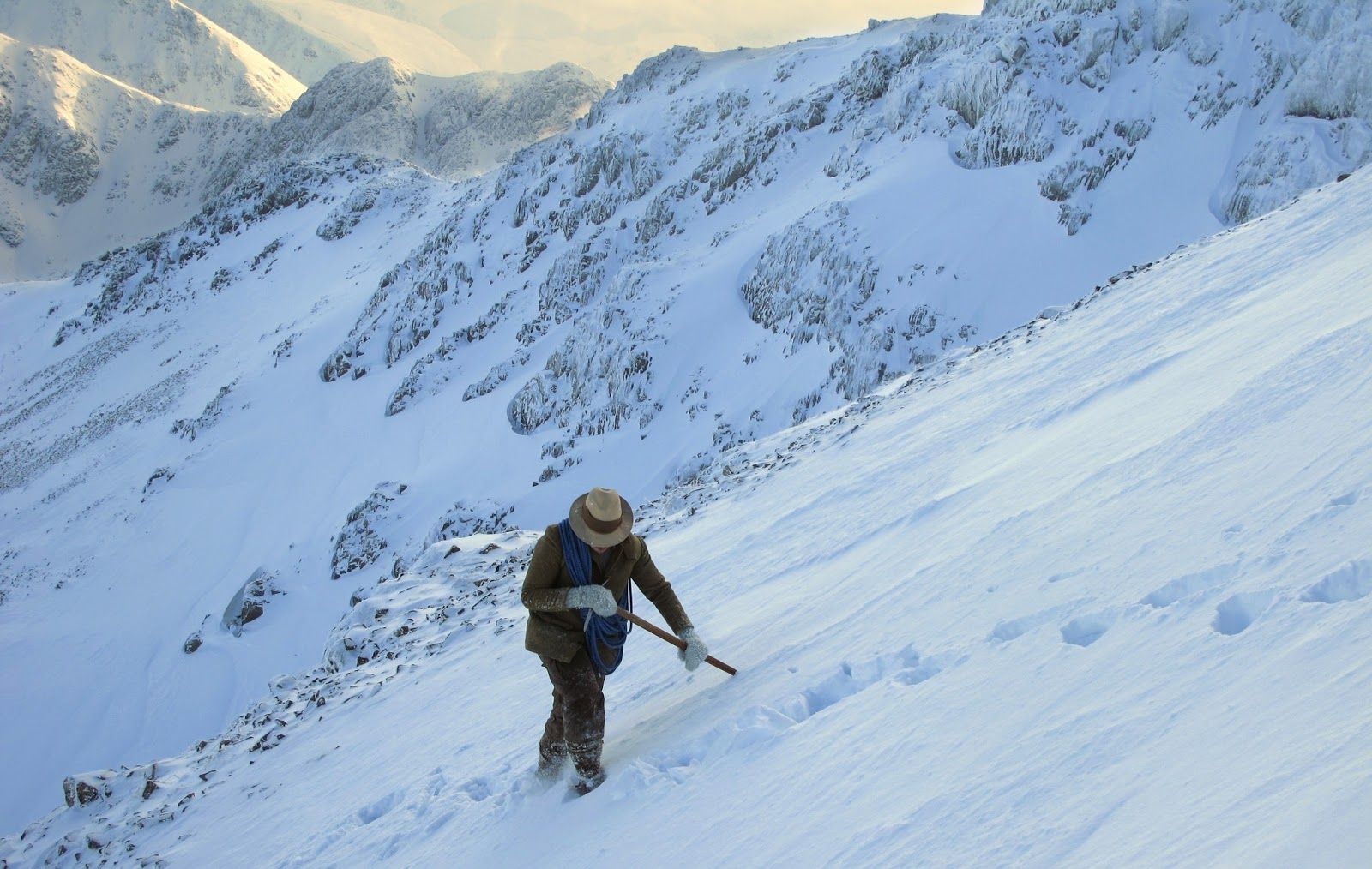 In this blog post I would like to share some of the best photos from last week, taken on location in Glencoe. As readers will be aware, Glencoe is a key location for my book and the first chapter takes place on the crags of Stob Coire nan Lochan. For the climb I used clothing and equipment that would have been familiar to the 19th century pioneers: rough tweed, woollen mitts, simple leather boots studded with nails, and a yard-long ice axe.