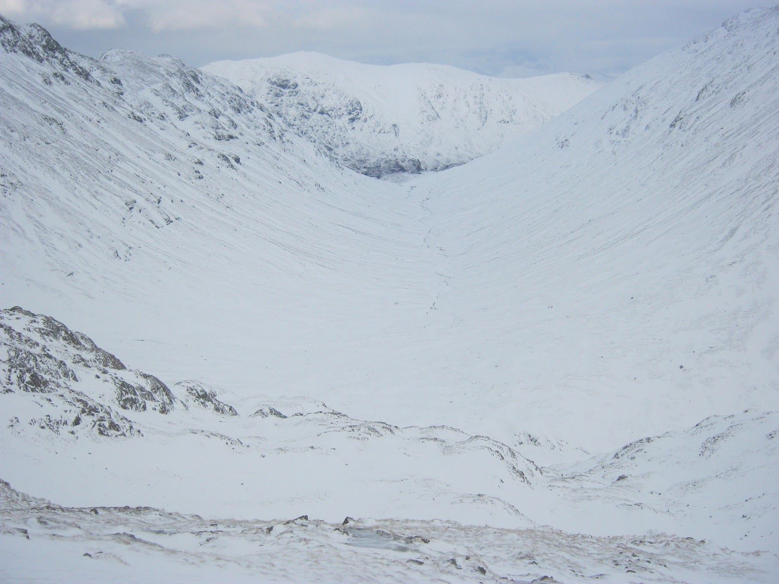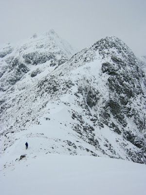 The main peak of Bidean throws three ridges down into the depths of Glencoe: Aonach Dubh, Gearr Aonach, and Beinn Fhada. All three require cunning tactics to approach direct from the glen; the easy walking routes are circuitous and indirect, and the scrambling approaches are devious. Beinn Fhada has perhaps the least obvious approach out of the three. The easiest route avoids crags on the left, zigzagging between enormous floes of ice to finally reach the ridge perched high above the famous Lost Valley.