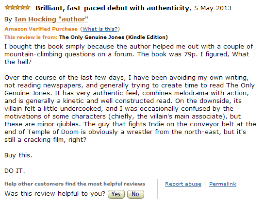 I recently corresponded with bestselling writer Ian Hocking, author of Déjà Vu, Flashback, and The Amber Rooms. He had a query relating to mountaineering in the early 20th century and as a result of this correspondence he decided to buy my book. A few short days later he finished the novel and wrote this corker of a review:
