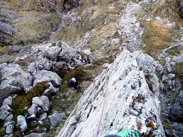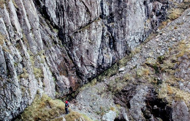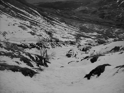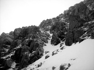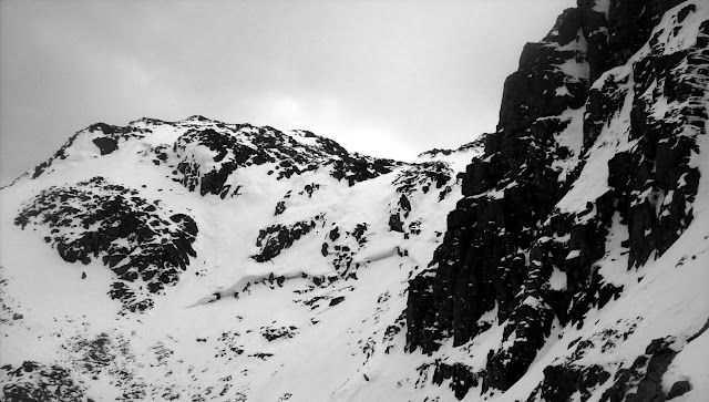 Locals were heard to say that they had seen nothing of the like in living memory, and one Mountain Rescue volunteer of my acquaintance proclaimed that anyone climbing on the cliff at the time would certainly have perished. Fortunately there were no casualties, although the enormous floes of snow in the corrie beneath remained in evidence right into April.