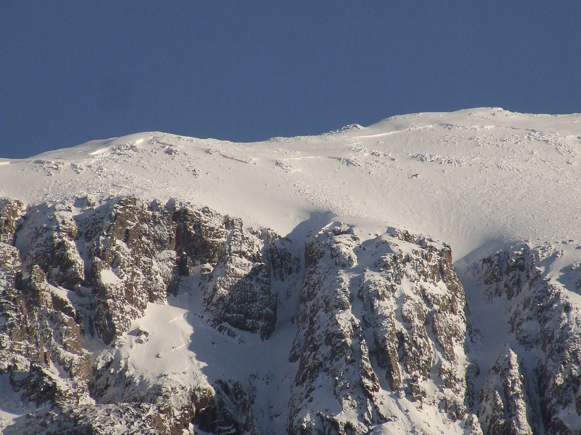 Locals were heard to say that they had seen nothing of the like in living memory, and one Mountain Rescue volunteer of my acquaintance proclaimed that anyone climbing on the cliff at the time would certainly have perished. Fortunately there were no casualties, although the enormous floes of snow in the corrie beneath remained in evidence right into April.
