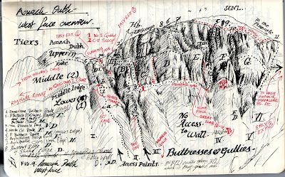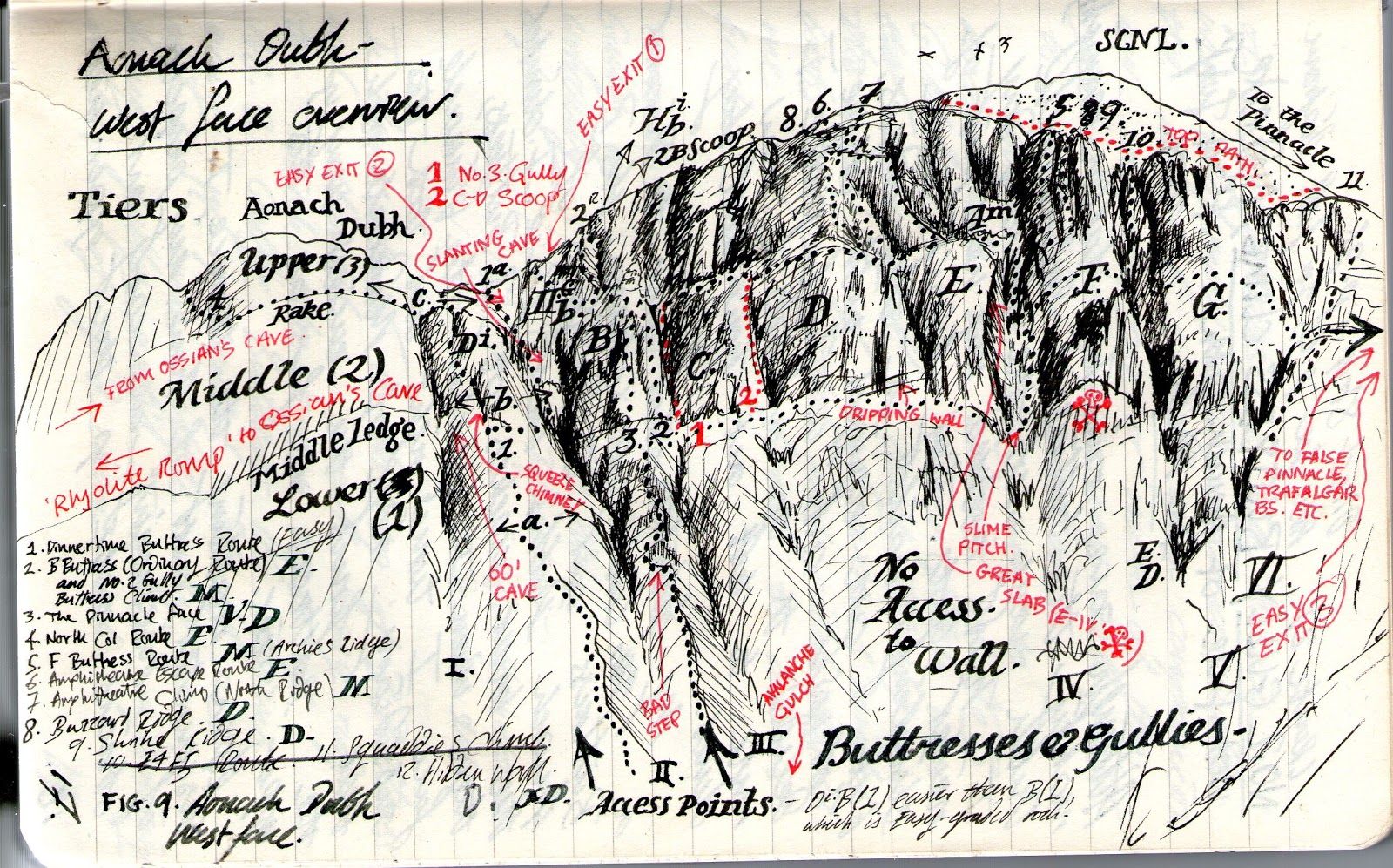 Aonach Dubh. For me the very name has the ring of adventure about it. This mountain wall in Glencoe faces west and is vast in scale, divided by near-impossible gullies into a series of battlements, turrets, terraces, rakes, and a hundred lonely and hopeless places where humans rarely venture.The West Face was the first object to catch my attention on my initial visit to Glencoe in January 2007, and over the coming years I waged a determined campaign to explore this sublime and frequently baffling place. In many ways the West Face came to personify my life in Glencoe and became something of an obsession for me.This page from my Glencoe crag book perhaps illustrates what I mean by ‘obsession’: