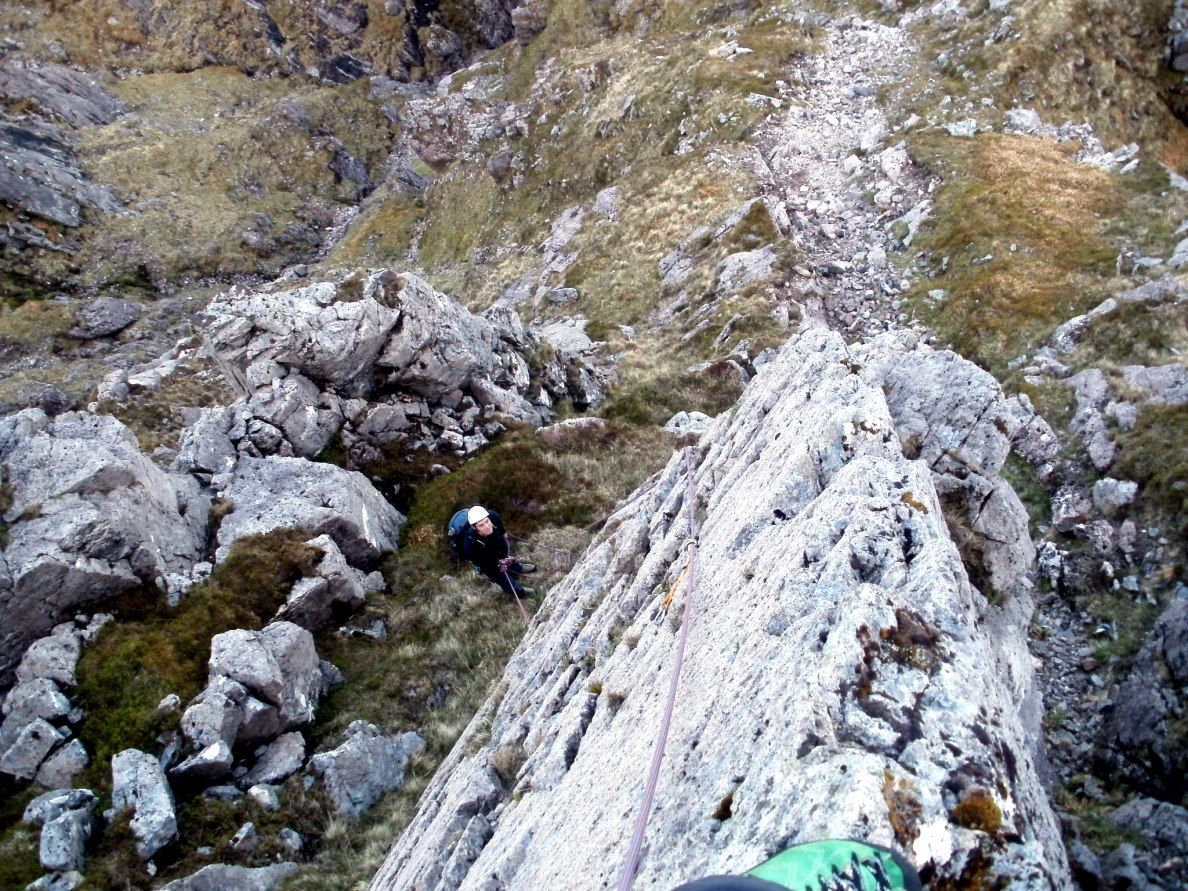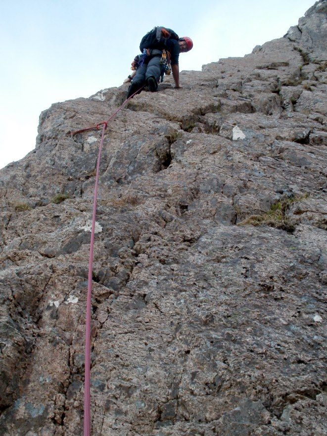 My first climb on the West Face was conducted on a wet and stormy October morning in 2008. My partner in crime was Rachael Murphy, an old friend from my university mountaineering days, and the route we selected was a little-known Grade 3 scramble known simply as B – F Buttress Route. Neither of us understood the confusing topography of the cliffs and from the very start it intimidated us. Our route proved to be a brutal struggle largely consisting of vertical squirming through mud-choked chimneys and pulling on clumps of grass instead of the clean rock holds we had expected.It was an old-fashioned adventure and I absolutely loved it!