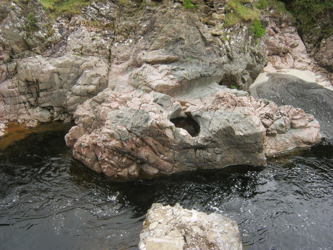 | This is the granite intrusion in the bed of the Tilt that James Hutton discovered in 1785, leading to his Plutonic theory in which the Earth was described as incalculably ancient – a constantly shifting geological process rather than an act of God’s will. |