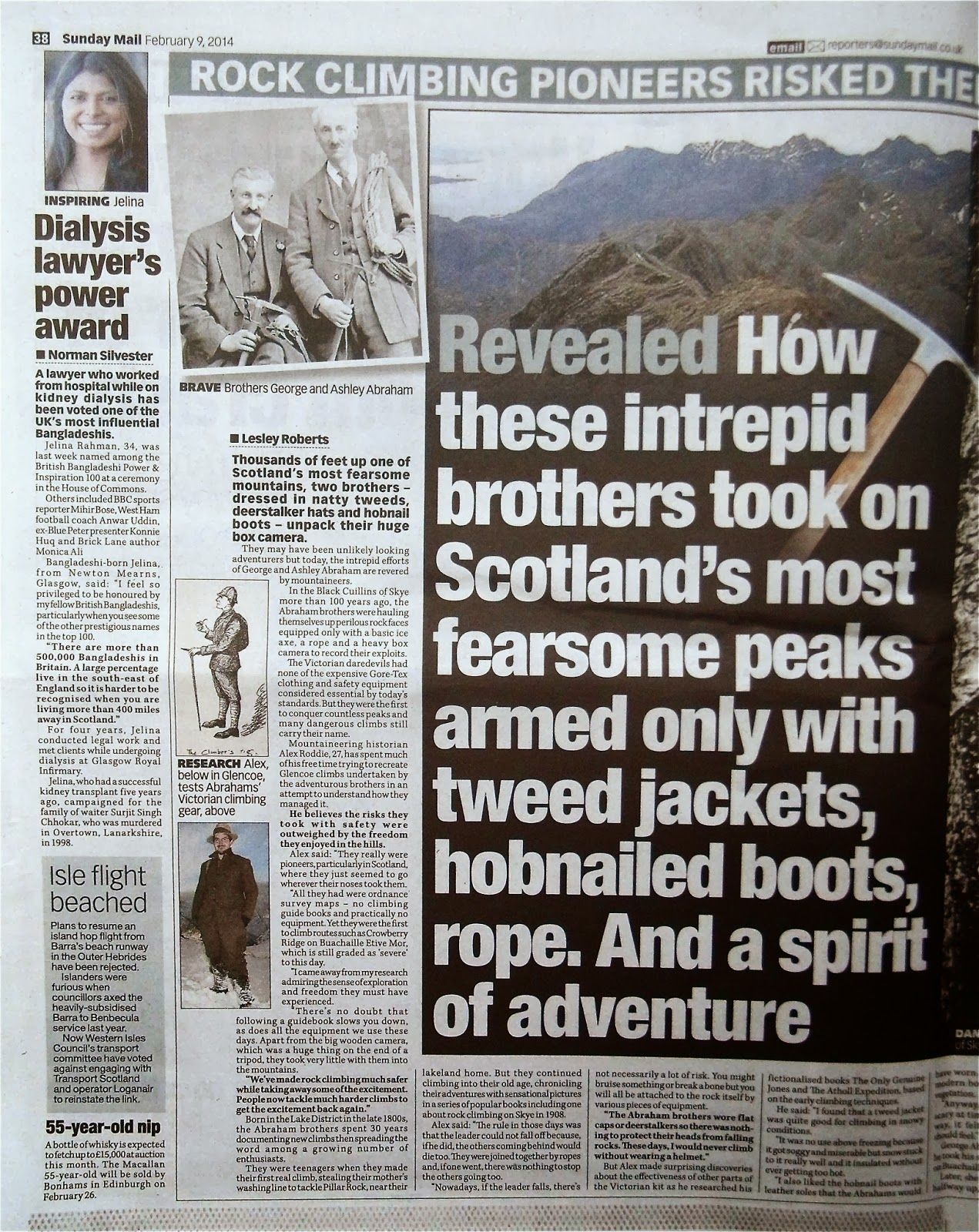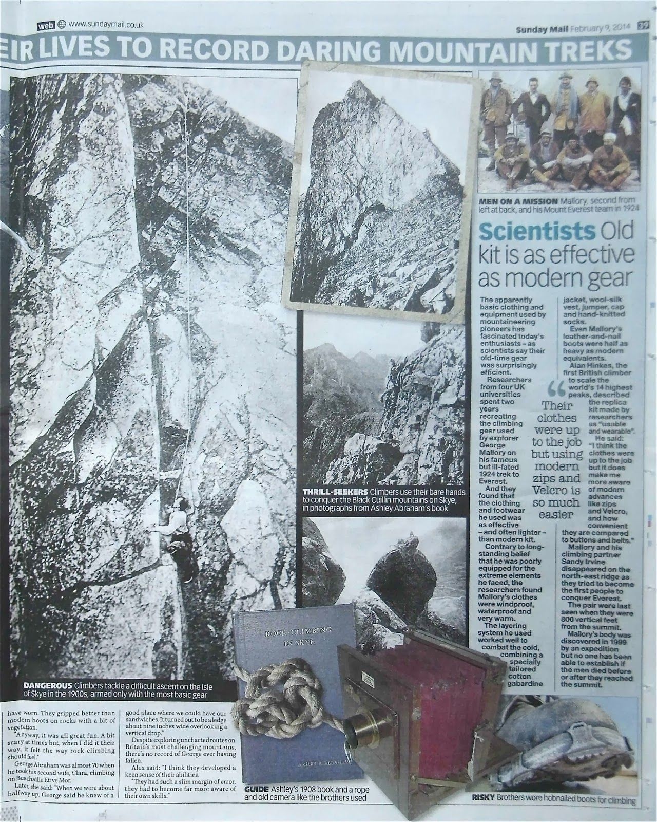 As one of the only living authorities on the practical use of 19th century mountaineering equipment and techniques, I was consulted by the reporter who worked on the piece. We spoke about the unique challenges of climbing in tweeds and nailed boots, the reduced margin for error, and the greater sense of freedom that comes from putting aside modern safety equipment.I’m really pleased with how the feature has turned out. I think the reporter has portrayed me well, I get a picture (plus one of my nailed boots appears too!) and both of my novels are mentioned.This is great publicity for me and rather well timed! You can read the article in the scanned images above or in today’s issue of the Scottish Sunday Mail.