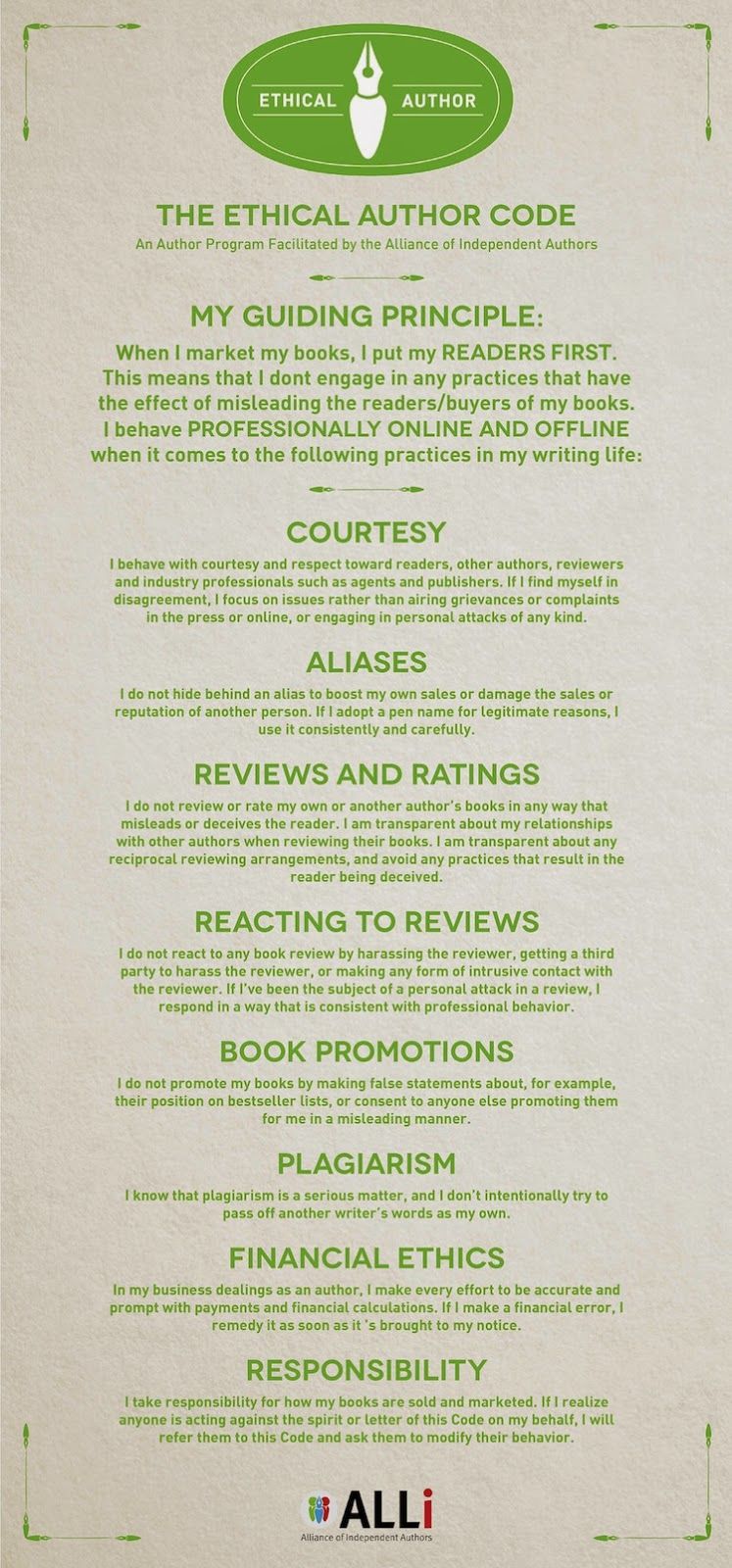 A new set of voluntary guidelines has been published to help keep writers on the straight and narrow. Most authors are honest in their dealings, but unfortunately there have been incidents where writers have falsified reviews, reacted poorly to bad reviews, copied the work of other people, or otherwise acted in an unethical way.