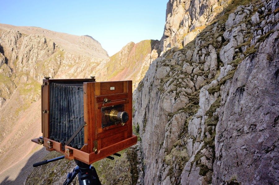 This particular camera is an Underwood Instanto, manufactured by the E & T Underwood Company in Birmingham. This model was produced from around 1886 to 1905 and is made from mahogany and brass, with leather bellows. Although the Instanto was made in quarter plate, half plate and whole plate sizes, this specimen takes 10×12 inch plates. It’s a gorgeous machine — but extremely bulky, which as we shall see is an important consideration for mountain use. The Instanto camera was sold for between £2 4s 6d and £6 2s when new.The owner of the camera, who has loaned it to the MHT, is keen for it to be used once again in a mountain environment. On the 20th of April 2014 it returned to the crags of Scafell to take part in the centenary anniversary of the first ascent of The Great Flake climb on Central Buttress, which was one of the greatest pre-war rock climbs of the Lake District.Professional photographer Henry Iddon is currently working on a fascinating project involving this camera. He intends to use the Instanto to record contemporary rock climbing images, in much the same way that the Abraham brothers used it to document the leading climbers of their era. I think anyone with an interest in either photography or mountaineering will agree that this is remarkable. Will a modern digital camera from the year 2014 still be operational a century from now? I very much doubt it.