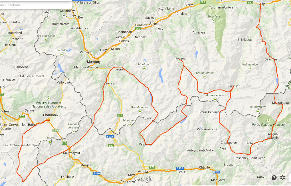My adapted “Grand Route Forbes” follows the majority of the original route, with a couple of omissions and modifications. I believe it takes the traveller through some of the finest landscapes in the Alps. Here’s a quick mockup on a Google Maps screenshot: