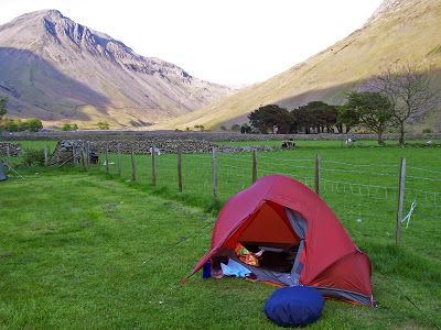| Base camp at the Barn Door Shop Campsite, Wasdale Head. This tent was a TNF Particle 13 — not a bad tent, but heavy by modern standards and tricky to get a perfect pitch. |