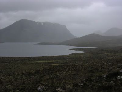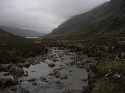 The river crossing was trivial (the water didn’t come far above my ankles) and I soon found myself standing on a path once again. The weather was poor by this point so I was pretty glad that the off-path section of that day’s trail was at an end. All I had to do was follow the path north and it would take me to the Shenavall bothy.It was, however, pretty rough as paths go: continuously waterlogged, often ploughing straight through massive bogs or eroded areas of peat. At times progress was so laborious that it was better to climb a little way up the hillside and traverse rough heather and scree. I started to realise that the arid conditions between Bendronaig Lodge and Kinlochewe had spoiled me a little! This was back to how things had been in Knoydart, without the complex topography and killer river crossings.But I felt cheerful. I wasn’t on the CWT for it to be easy. I wanted a challenge – if I had wanted easy walking on nice paths I would have done the West Highland Way. So I made what progress I could and I enjoyed the splendid, beautiful desolation of my surroundings.