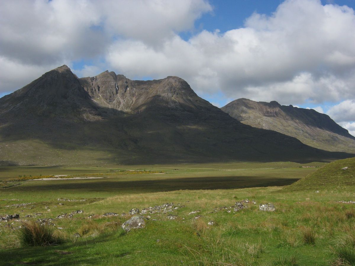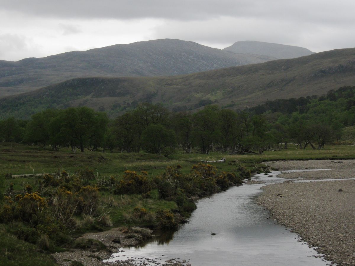 The route from Shenavall to the main road at Inverlael went over two passes: the first beneath An Teallach to Dundonell, the second over wilder moorland at a similar elevation. I enjoyed both passes tremendously. The first was wooded and ridiculously scenic, like a small portion of the Alps dropped into Scotland; the second was the usual combination of wide open spaces and endless bog/peat, but the views more than made up for it. And I was making good time.