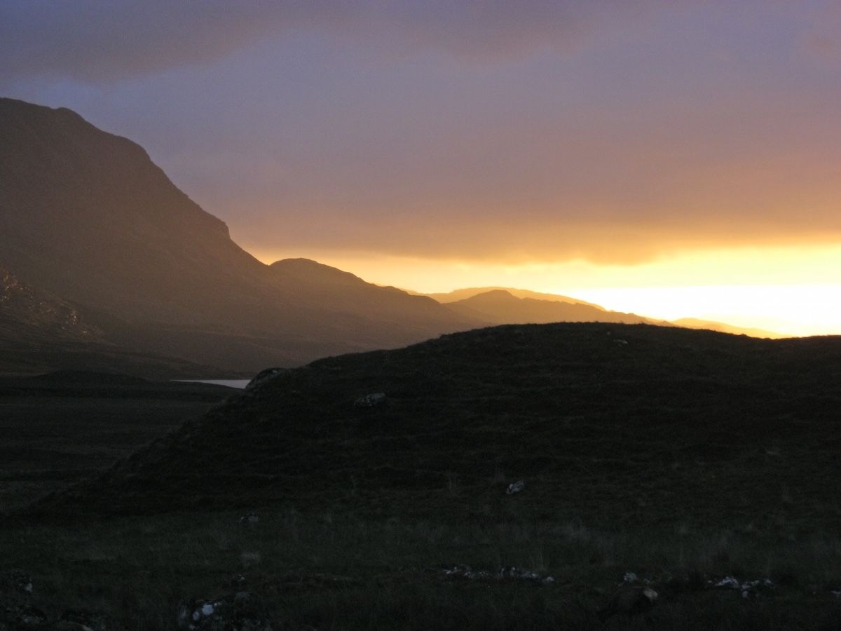I needn’t have worried that the bothy would be full. It’s pretty big as bothies go. One other person was in residence – Martha, a section hiker doing the CWT between Achnasheen and the Cape – but others soon turned up, and before long we had a fire and a merry gathering in the common room.It was a classic bothy evening. Altogether the company included four hillwalkers just down from the Fisherfield Six, two down from An Teallach, Martha the section hiker, and myself. Two different single malt whiskies were doing the rounds and we all chatted about mountains and mountaineering while our socks and shoes dried in front of the fire.Martha and I compared notes on the trail. Although her planned route was very different to mine, we were both aiming to finish on about the same day and I wondered if I would see her again on my travels. I hadn’t seen any other CWT hikers for nearly a week and I had started to miss the social aspect of the trail – the sharing of plans and ambitions, the telling of tales at each meeting. I’d had to make do with reading entries in the bothy books as I’d passed, but more and more names I had followed from bothy to bothy were starting to disappear as I moved north. I didn’t know if they had left the trail or simply gone a different way. Hiking alone is great but I also found I enjoyed being a part of the nebulous CWT community.At about 10 p.m. the rain finally cleared, allowing the sunset to pierce the bottom layers of the clouds for a few glorious minutes – just long enough for me to run outside with my camera.