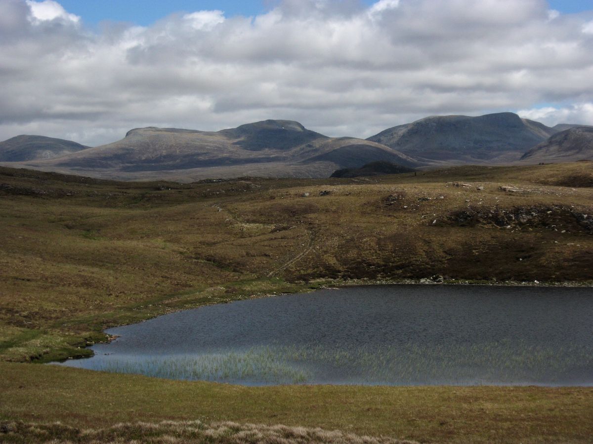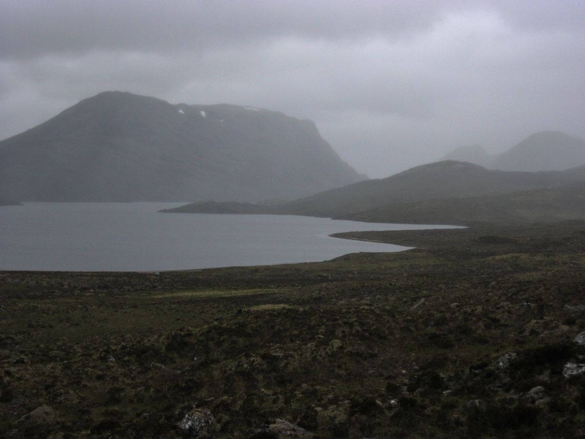Getting from the end of the path at Loch an Sgeireach to the Strath na Sealga involved navigating the pass of Bealach na Croise. The terrain was not particularly steep or rocky, but navigation proved to be a little tricky in the foul weather and I ended up wishing I had taken a compass bearing from the start. Something about the contour lines deceived my (usually excellent) sense of direction and I ended up on the wrong side of a small lochan, convinced I was facing north instead of east! I knew something was up when the terrain ahead didn’t look as it should, however, and a glance at the compass set me back on course.More contouring – I was getting good at that technique! – took me to the summit of the pass, but not before some truly monstrous peat hags had to be dealt with. On one occasion I found myself staring down a vertical bank of peat nearly ten feet high. Several lengthy diversions to avoid this and similar obstacles made the crossing of this pass take longer than expected.On the other side of the pass, I started to follow a vague stalker’s path on the left bank of a burn. It went the right way to begin with but after about half a mile I realised it was not descending, and I was at risk of contouring into one of the high corries of Mullach Coire Mhic Fhearchair – not at all where I wanted to be. So I abandoned the path and set a bearing for the river, splashing through the endless bogs and peat.