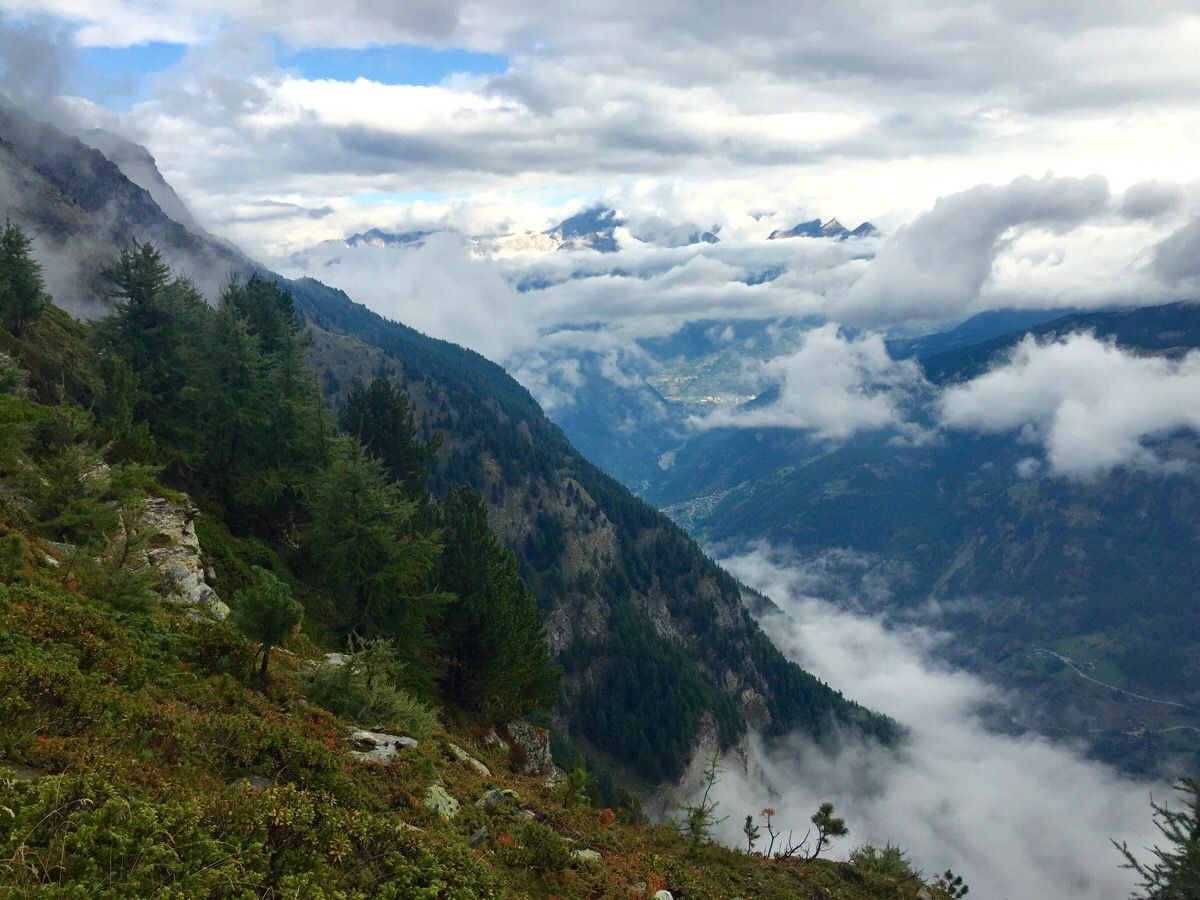 The Balfrin Höhenweg, which wends its way south from Grächen to Saas Fee along the steep eastern flank of the Mischabel range, proved to be an amazing trail. Every step along that path is an absolute delight. In contrast to the Europaweg, which was frequently scary and intimidating, the Höhenweg sticks to a lower contour – it doesn’t really get above 2,300m, and being four hundred metres lower make all the difference. It dips in and out of the forests of the Saastal, taking you through glades of incredibly ancient and gnarled pines, hanging with mosses; ibex and chamois bound down the slopes and climb expertly across the crags; and everywhere there is a wonderful profusion of plant life, just starting to show autumn’s colours here and there. Colourful mushrooms and toadstools dot the woodland floor. This forest has, to my knowledge, never been managed or cultivated by man – it’s true wilderness, and in a very real and tangible way it felt like home.