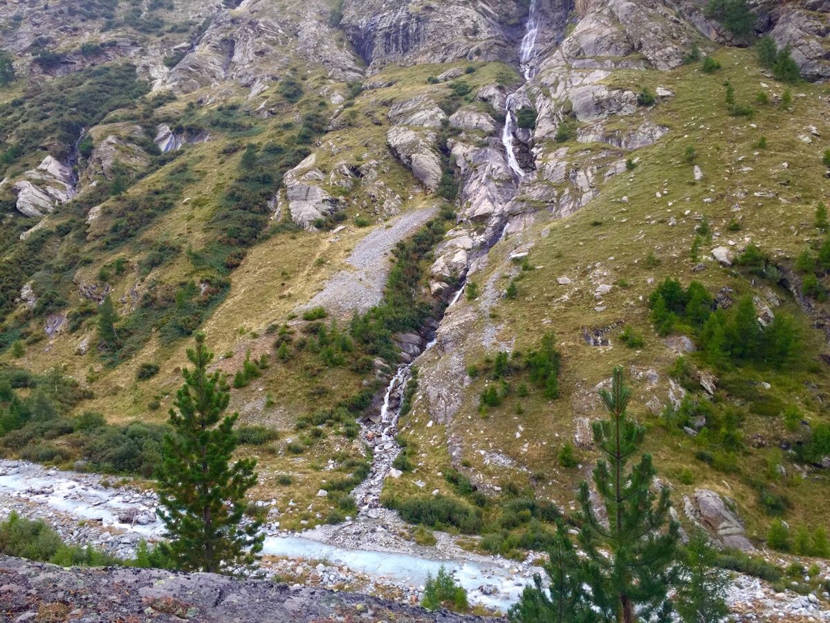 There’s still a lot of hill fog about, but when I could see the views they were stupendous. Overnight rain had dumped snow down to about 2,900m and the peaks on the other side of the Saastal sported a sharp new snowline that receded as the day wore on and bursts of sunshine started to melt off the new snow. At one point, the trail dipped down to a major torrent, the Schweibbach, choked with moraine and log dams, which plunges down from the pinnacled heights. Far above, the crumpled, icy mass of the Balfringletscher gleamed like a new tooth.
