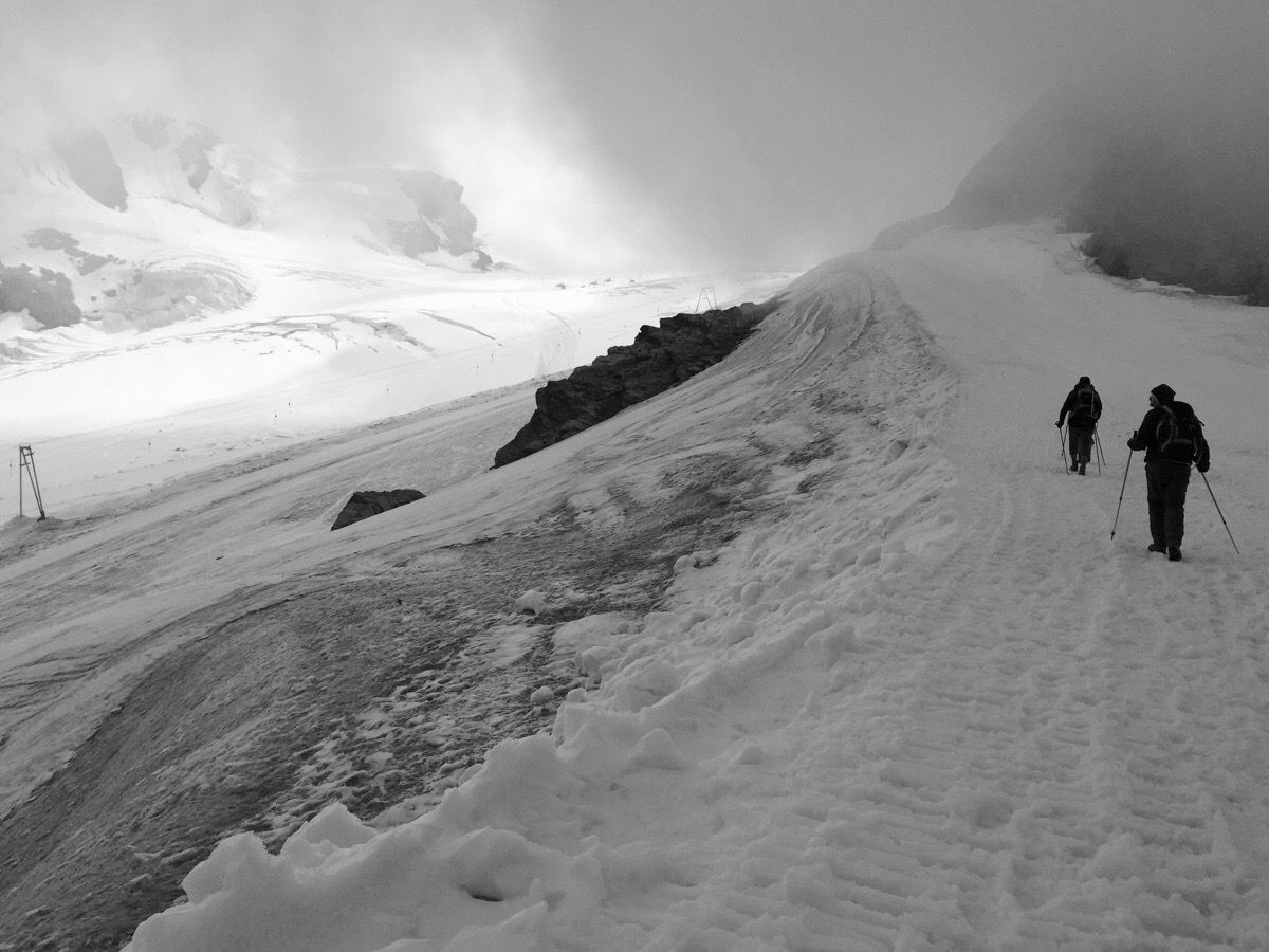 When I reached the col at almost 3,300m, I got my first view down into Switzerland. The glacier extended below me, cold and crevassed and (surprise, surprise) bedecked with ski infrastructure. Above and to the right, the peaks of Klein Matterhorn and Breithorn towered, plumes of spindrift arcing over their summits. A bitter wind cut through my layers of clothing.