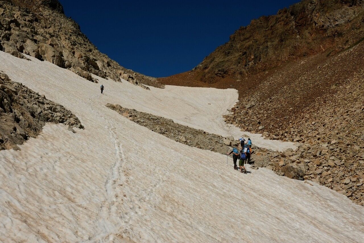 A long rising traverse around the brittle South Face of the Pics Chabarrou brought me to my second col of the day, the Col des Mulets. According to Joosten, an obvious path leads the way down, avoiding a large permanent snowfield, but I couldn’t find any alternative path. Maybe it was still buried under the snow. The snowfield was more like a mini glacier, to be honest, several hundred metres long and crevassed in places, so I tooled up with spikes and ice axe before making the descent.