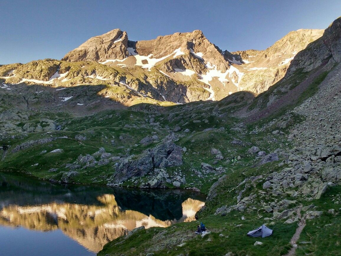 My reward for an early start was a spectacular colour show when I reached the Lac d’Aratille at 2,247m. The dawn terminator swept down from the crags above, the snowfields already blazing vivid yellows. Down by the shores of the lake, wild campers began to stir and shake the frost from their tents. The mountainside was a rich carpet of alpine flowers, yellows and blues and purples, and cinnabar moths fluttered everywhere like sparks caught in the dawn’s rays. If ever there was a paradise for thru-hikers, this place must surely be it.