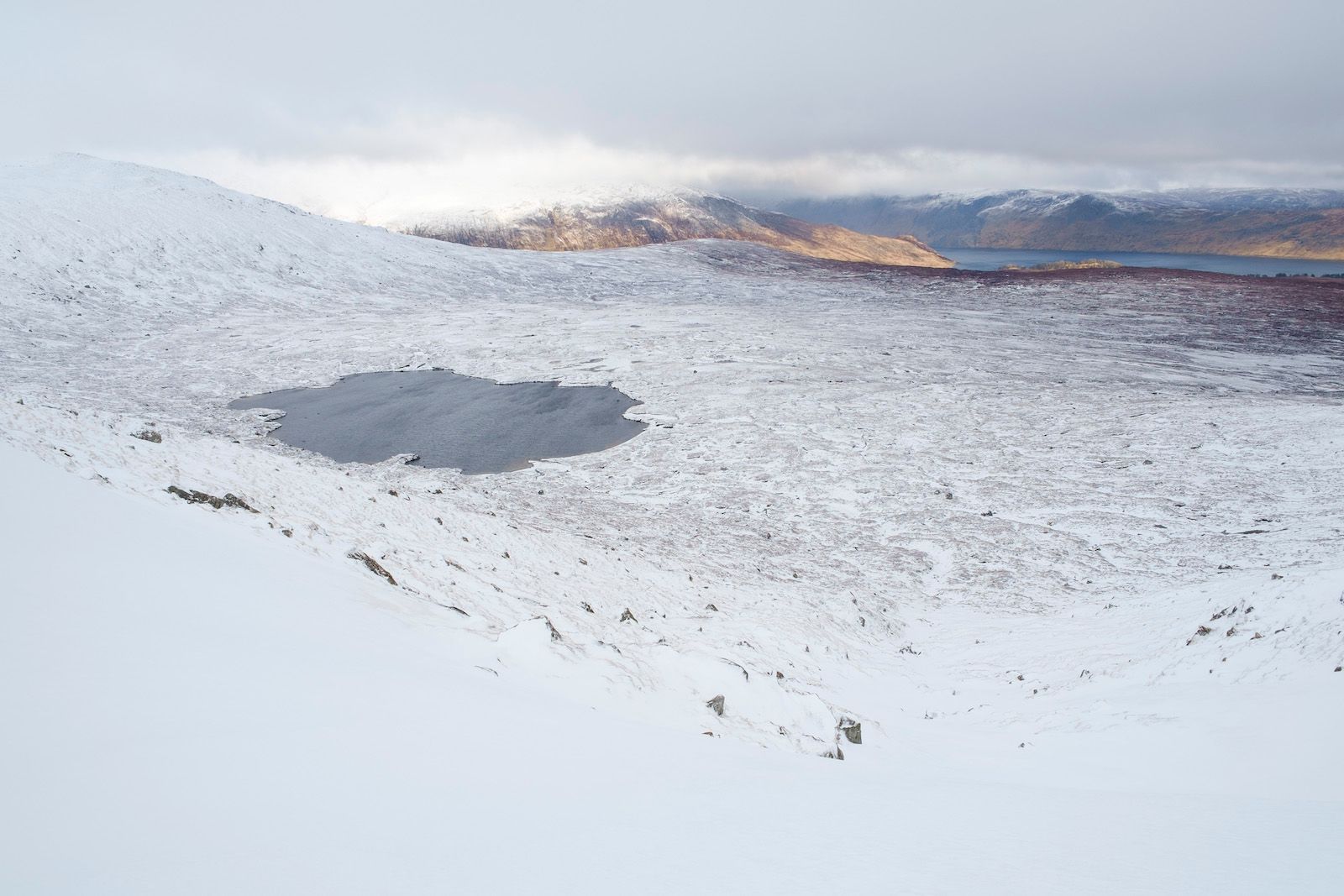 Navigate to Loch nan Stuirteag, a lochan between Monadh Mor and Sgor an Lochan Uaine. Start by following a footpath SE, which passes to the north of a 957m spot height before veering east towards a burn. Cross this burn, then head due east to bealach 876m. Contour around the northern side of Tom Dubh (918m) and follow the north bank of the Allt Luineag. In winter and spring, beware of lochans and watercourses concealed beneath deep snow pack.
