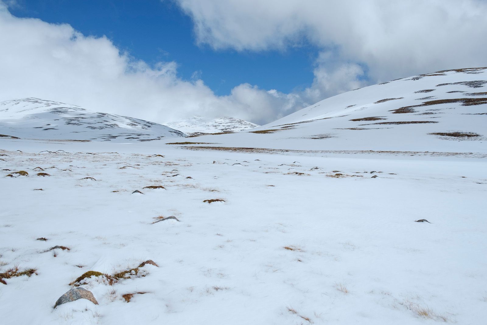 Cross the bridge over the Dee and head north. After a couple of miles, views open up west into Garbh Choire, the place where snow lasts longer than anywhere else in the Scottish mountains. If visibility is good you’ll almost certainly see snow patches or snow fields on the upper cliffs of Braeriach.