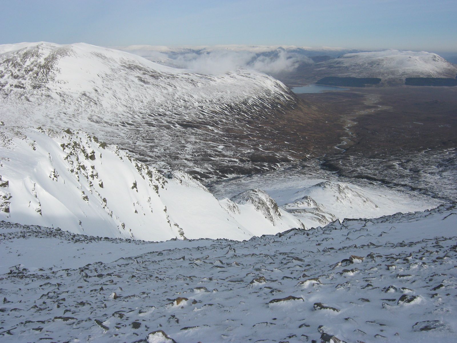 From Sron Bealach Beithe, follow the rim of Garbh Choire to the 1,148m summit of Ben Alder. Descend west, at first across a gentle plateau and then down a steepening stony shoulder to the path coming from Bealach Cumhann. Follow this path NE to a bealach, then down a deep valley past the now-defunct bothy of Culra. The path continues to Ben Alder Lodge where it becomes a good track beside Loch Ericht. Follow this track to Dalwhinnie.