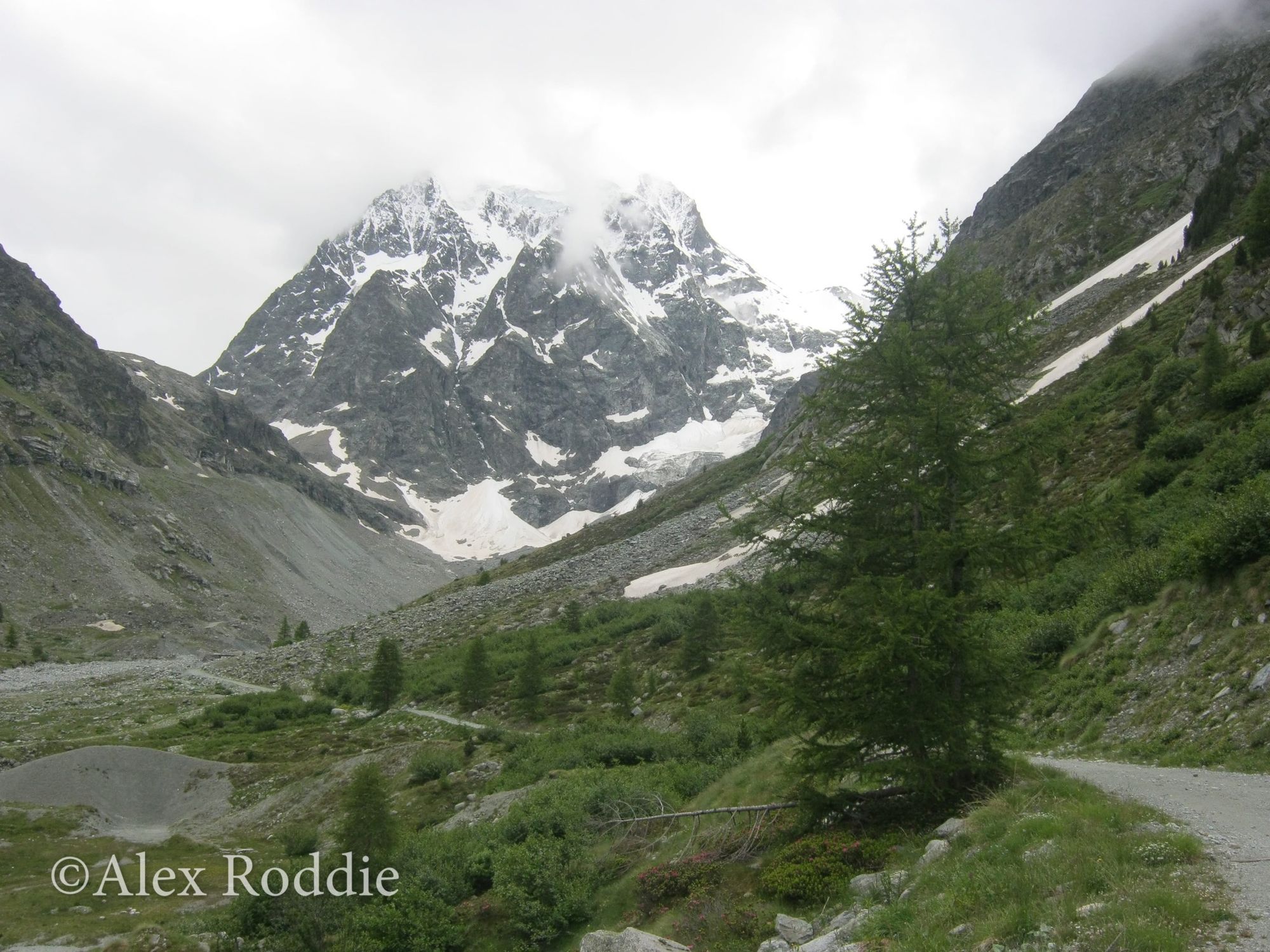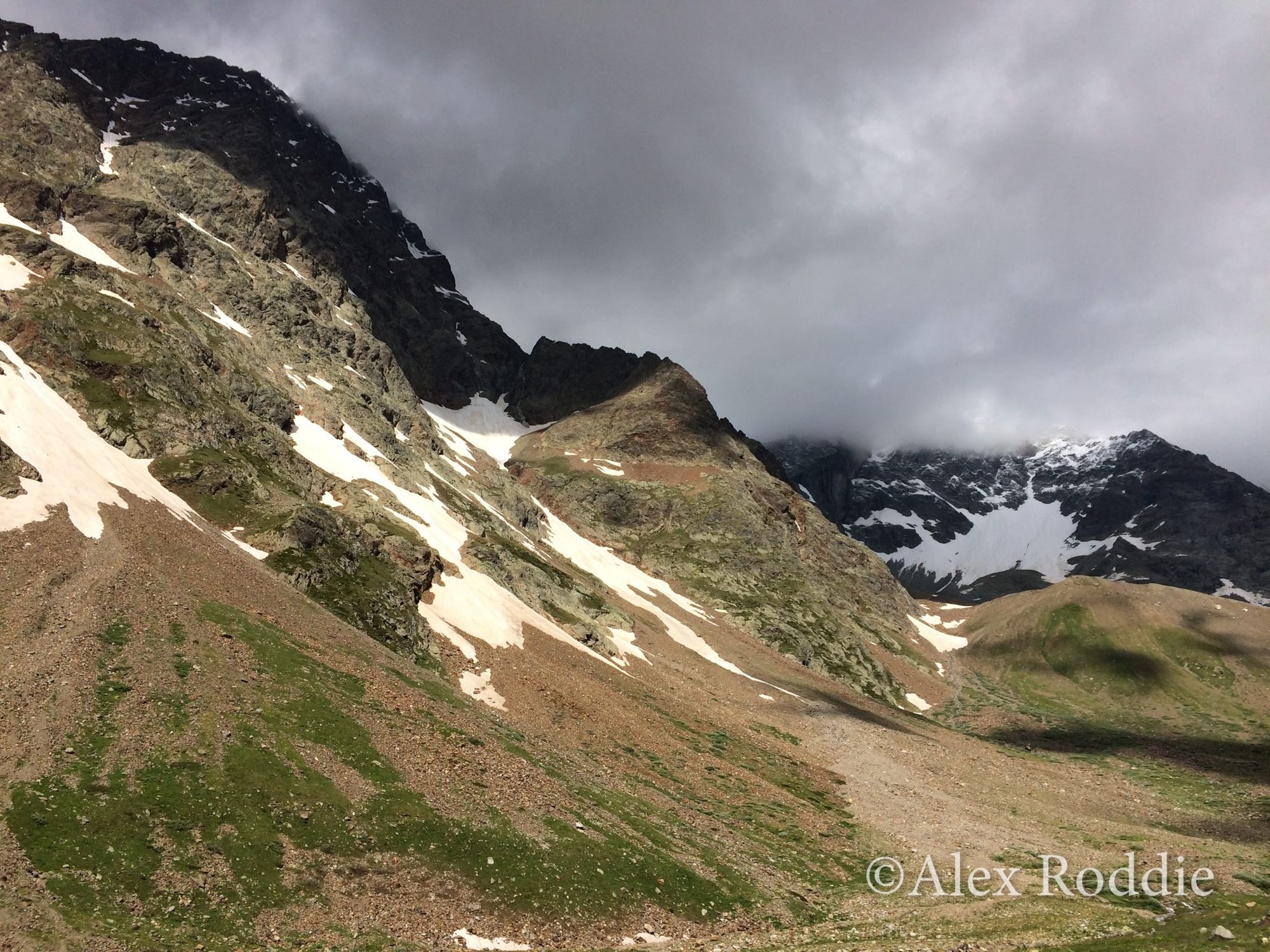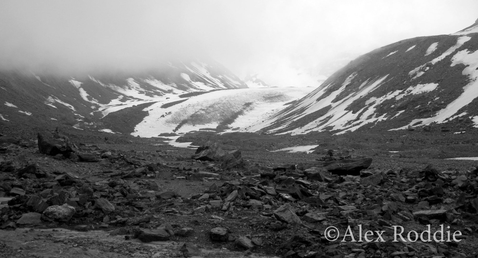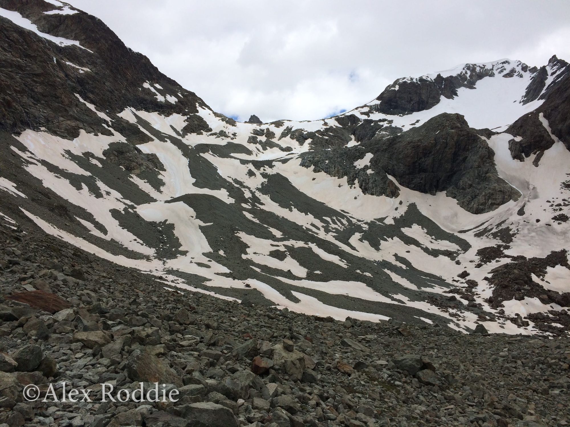 As I hiked uphill I saw the basin where the glacier had once resided. In the present day it’s no more than a corpse of a glacier: a great collapsed heap of old moraine, dashed with snow patches and streaming with meltwater torrents.