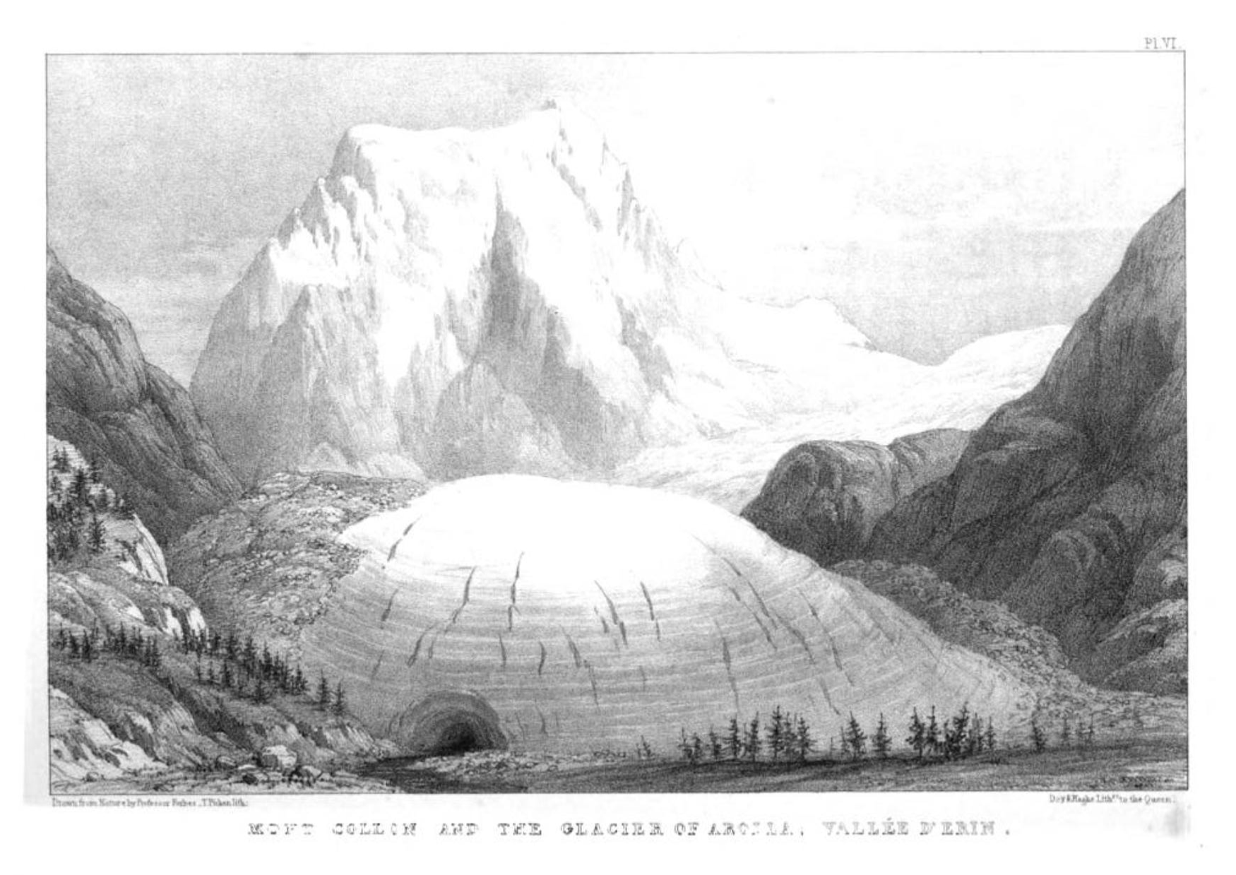 The glacier on which we now were stood is the Glacier of Arolla, that which occupies the head of the western branch of the Valleé d’Erin [Val d’Herens]. It is very long … The lower extremity is very clean, little fissured, and has from below a most commanding appearance, with the majestic summit of Mont Collon towering up behind.