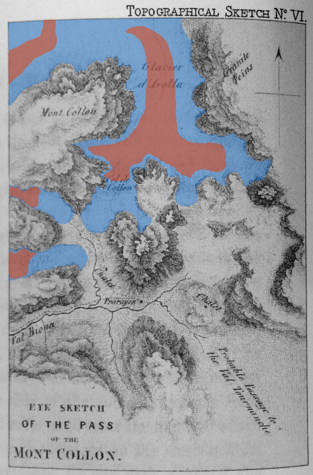 Forbes drew a sketch map of the Col Collon pass which quite clearly shows the glacier extending SW from ‘Col de Collon’ to beneath the 2,700m contour. All this ice has gone since 1842. As I held Forbes’s map up and surveyed the landscape, comparing it with my modern Swisstopo map, I was astonished by the damage.