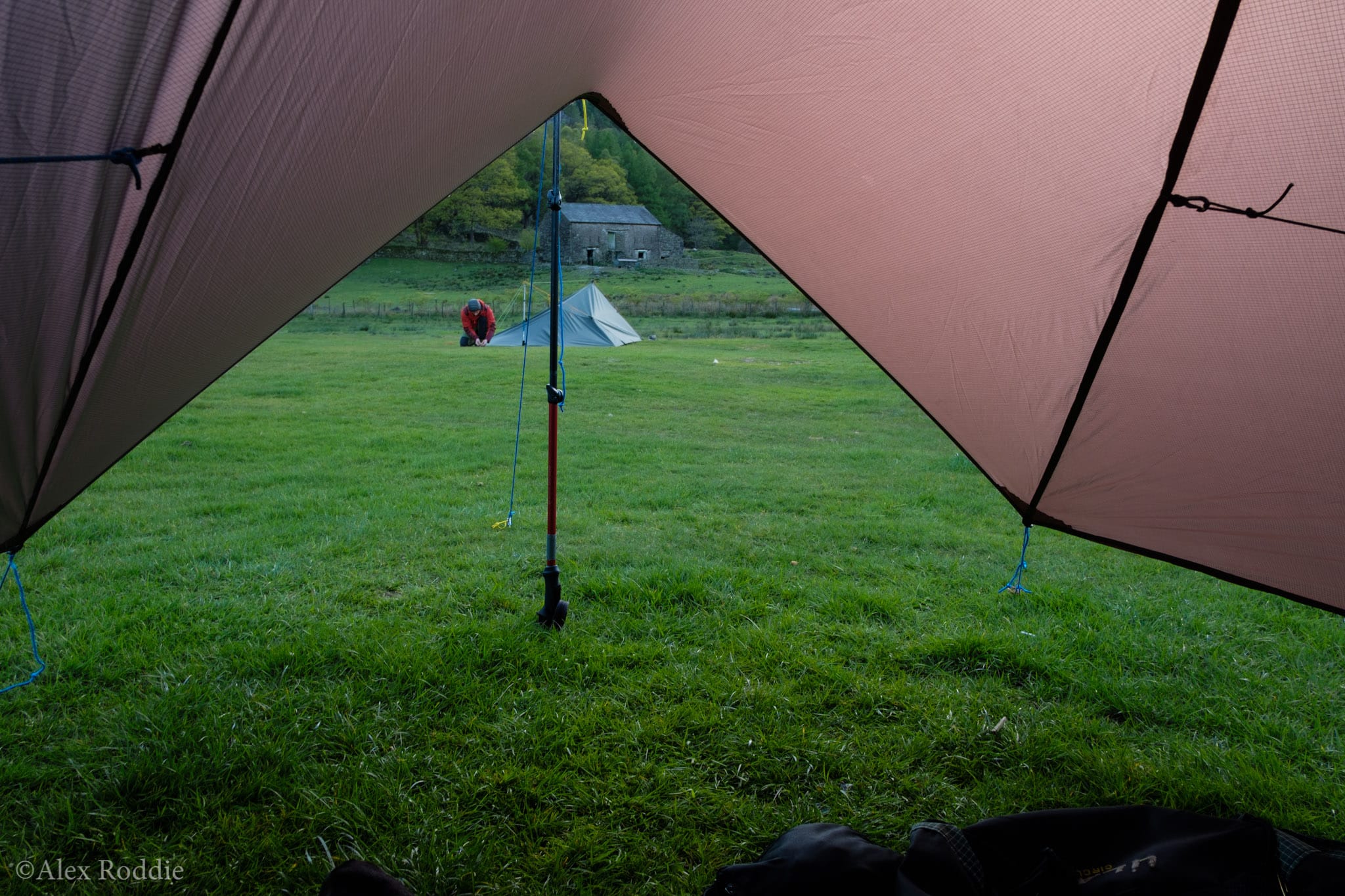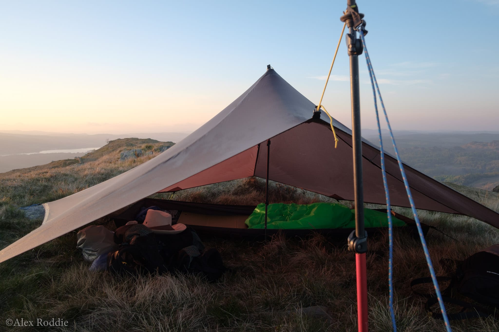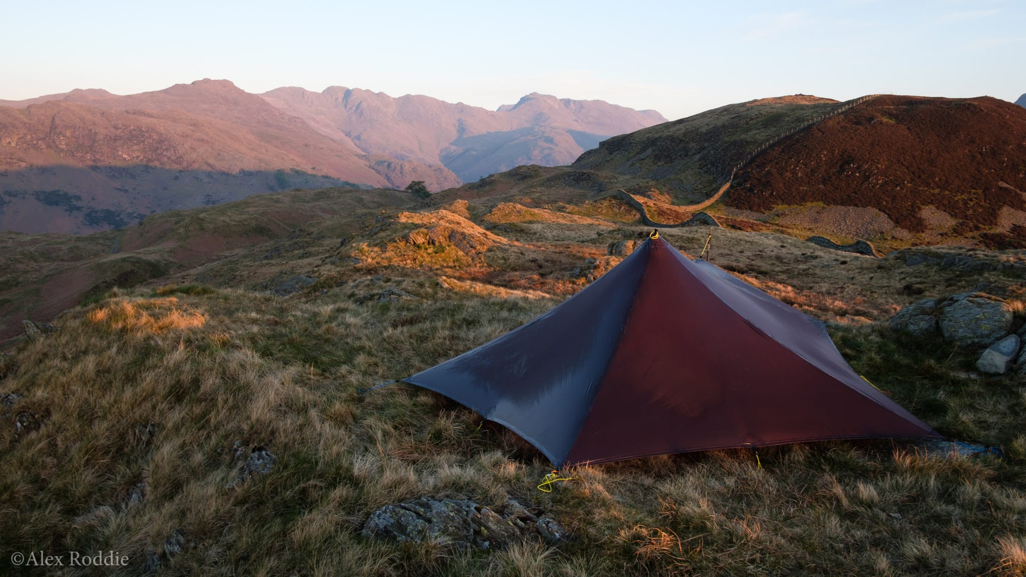 That night I camped at Baysbrown Farm Campsite in the valley bottom, and made friends with a German hiker who planned to stay in the area for a few weeks and do some bouldering. I didn’t know anything about bouldering in Langdale, but we spent a while discussing our tarp setups. His was a large flat tarp in a complex, cave-like pitch suspended from his trekking poles and multiple guys; it would have kept rain off him very well had it rained, but didn’t do so well in the strong wind. He ended up re-pitching it twice that night before eventually striking it and cowboy camping on the grass instead. I convinced him of the Trailstar’s obvious superiority for windy, exposed UK camping, and he promised to check it out. I need to start charging Mountain Laurel Designs a commission!