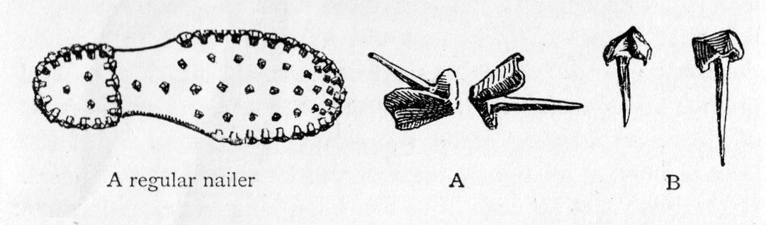 …with a row round the edge a climber can go anywhere in perfect safety, but it is better to add others shown in the drawing. The heel of the boot should be similarly garnished, a row of nails (often omitted) extending across the front part.
