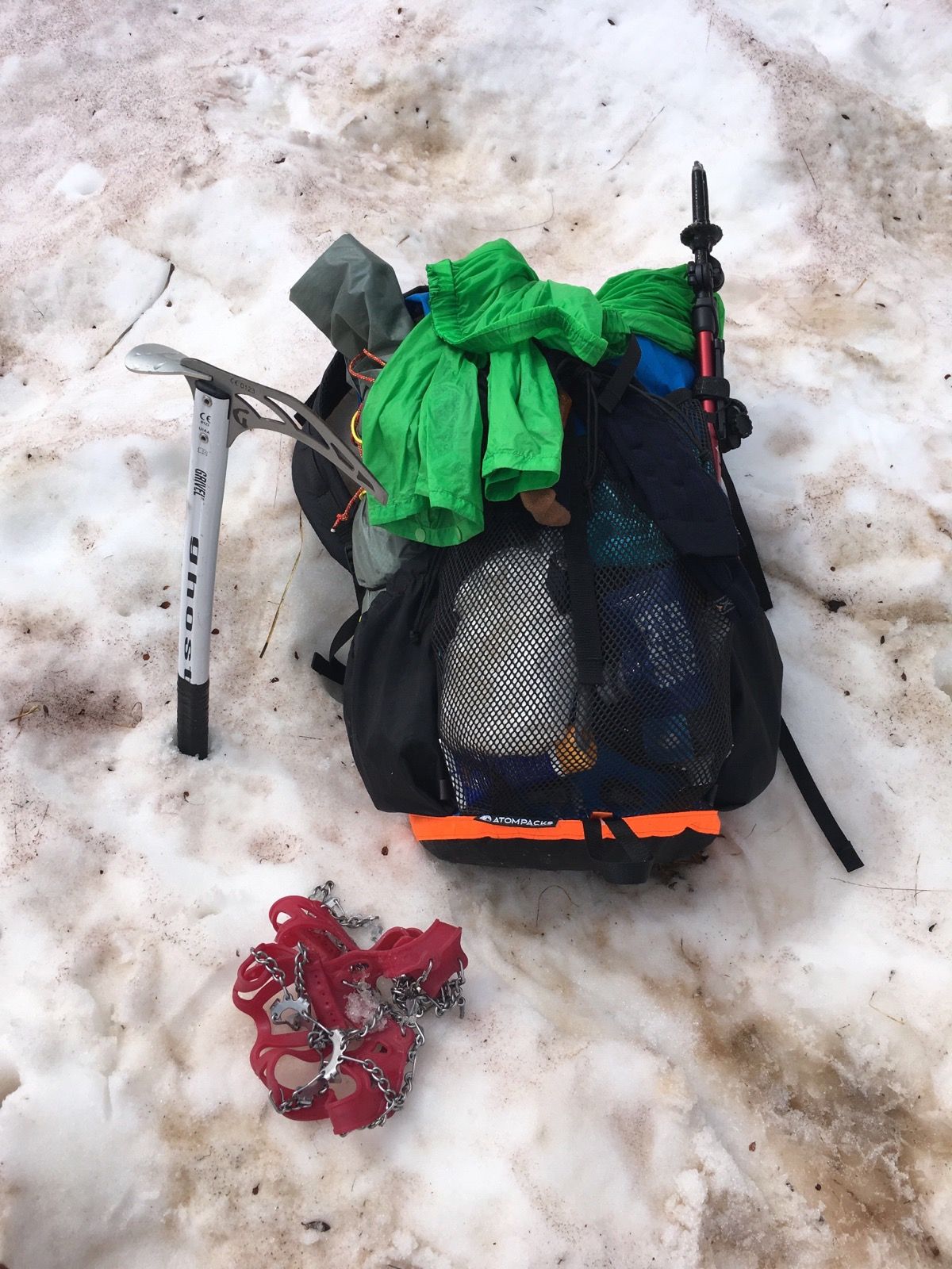 In the snowy conditions I encountered on this trail, packing an ice axe and some traction was a wise choice. I would have managed with spikes alone as the trails were well stepped-out, but I appreciated the extra security of my axe on steep ground. Full crampons would have been overkill for the conditions I experienced.