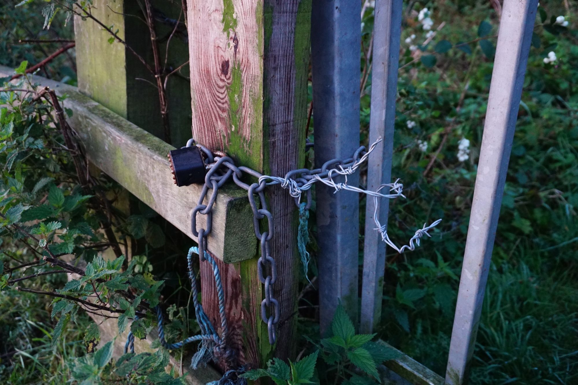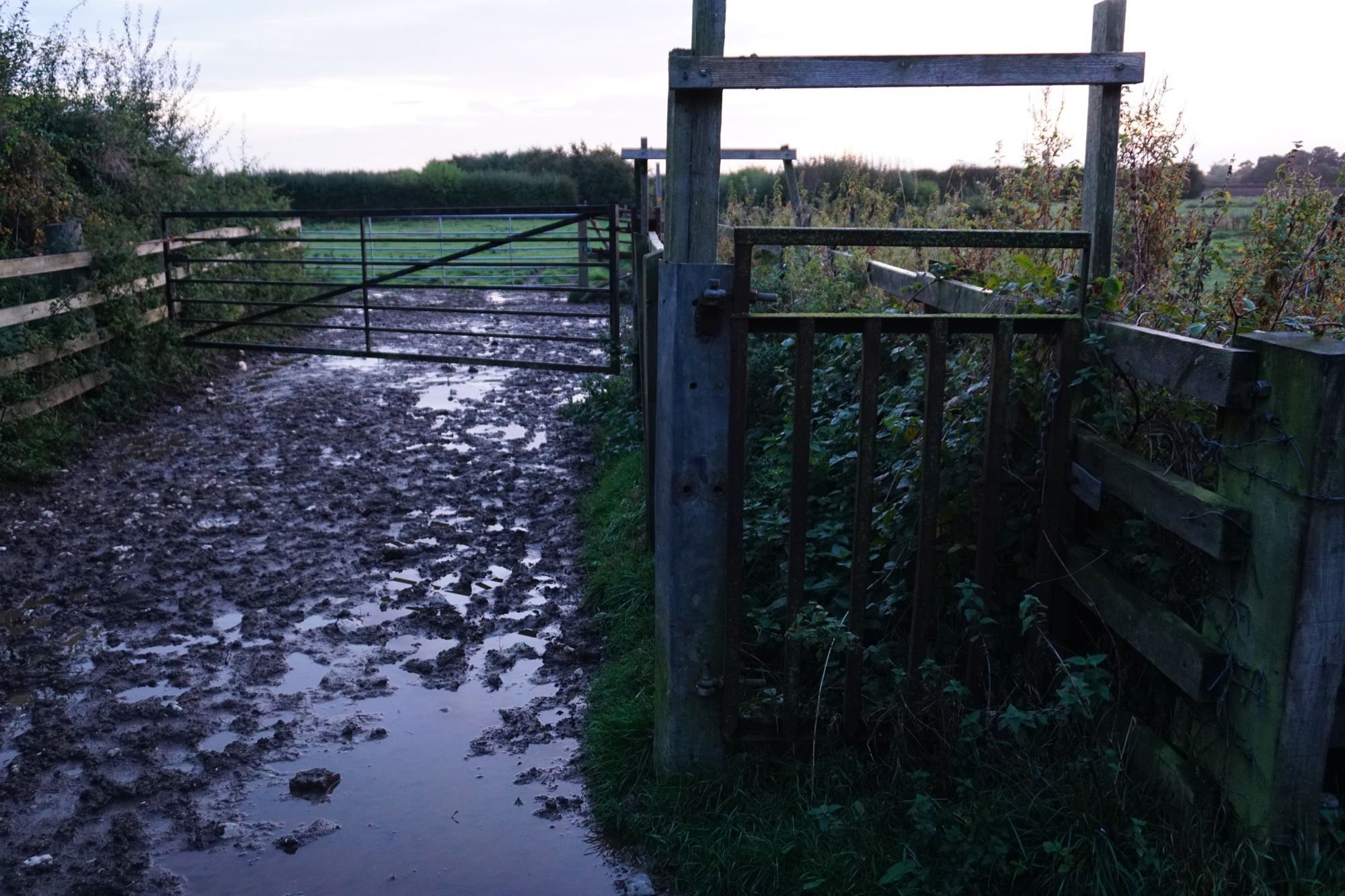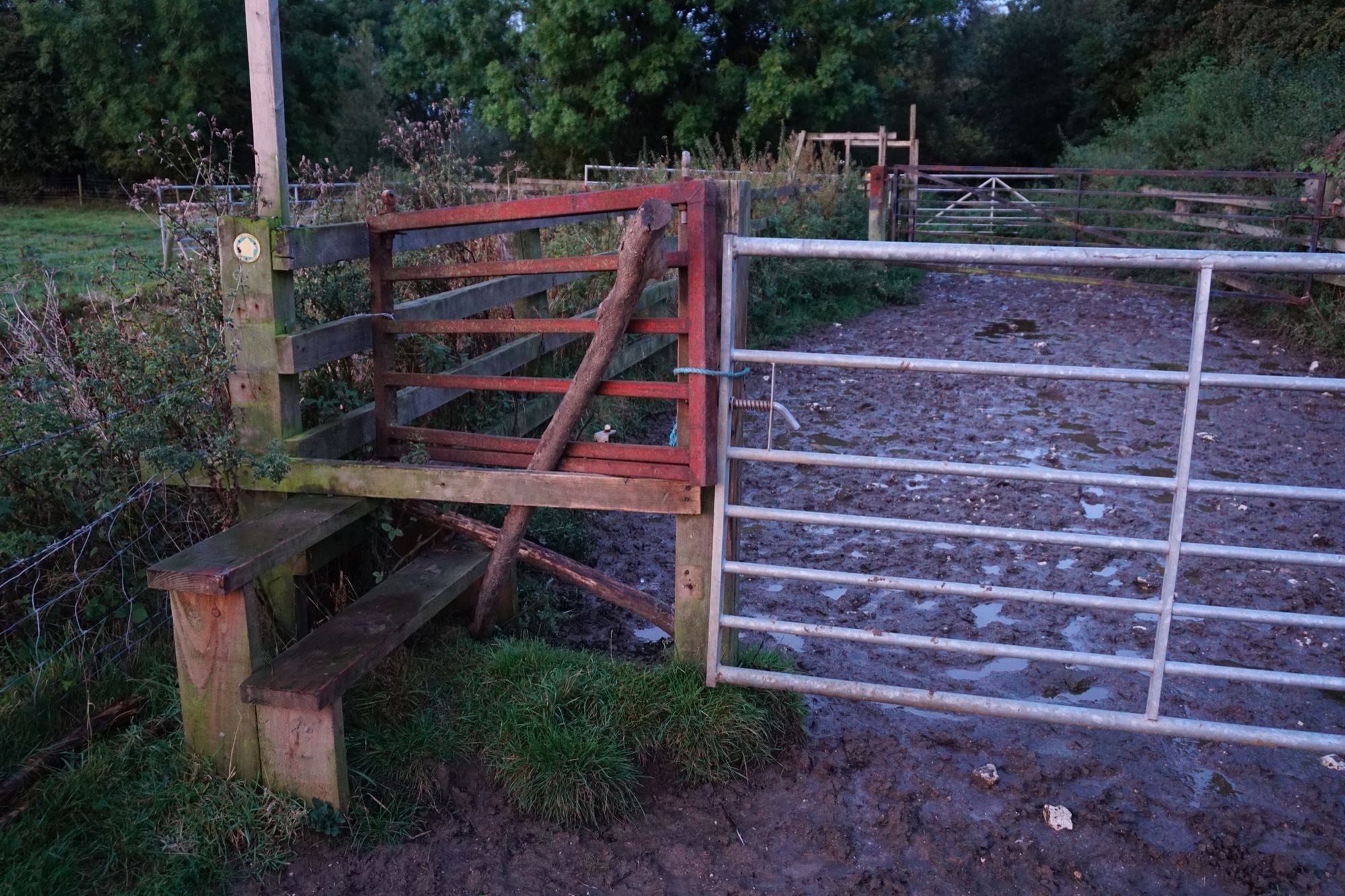 Yesterday morning, I walked my usual round to find both gates tied shut, the escape corridor impassable as always, and the stile barricaded. Again, let me remind you that this is a public right of way. I climbed over both gates and waded the mud. Fortunately in late September it isn’t too bad, but in a couple of months I fear this section of path may become completely impassable.
