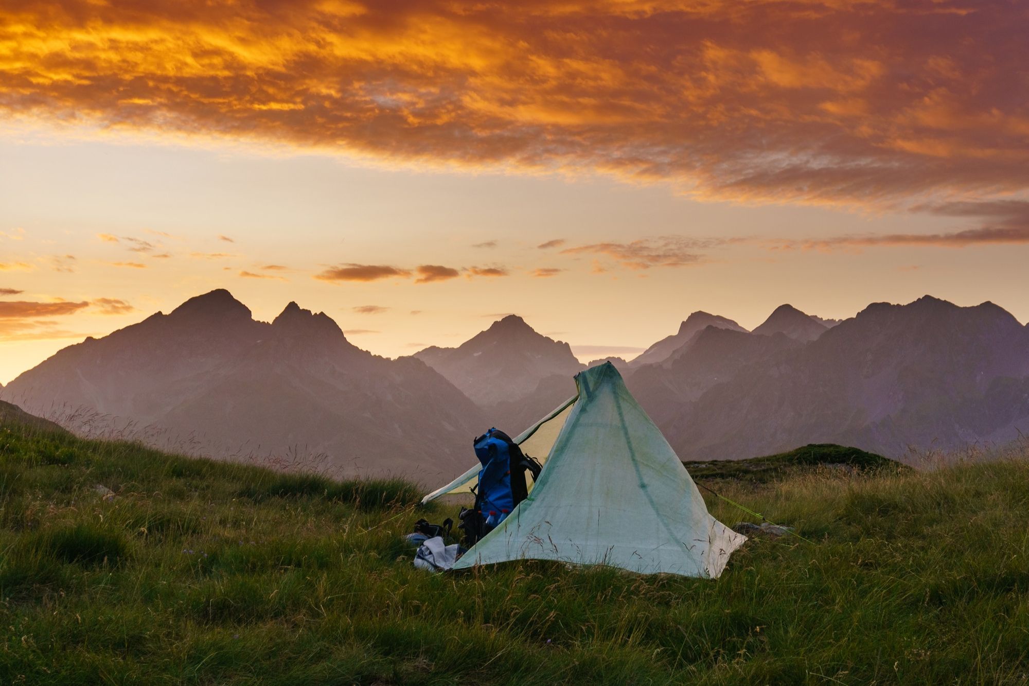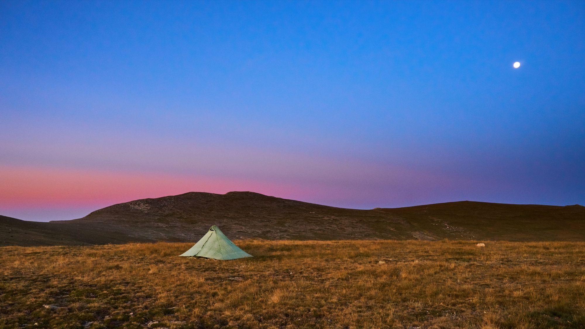 The best camp of the HRP was only a few days from the end. With only one 2,000m peak left to climb, and limited time left in the high mountains, I found myself traversing a long ridge that connected together a series of flat grassy plateaus. I could pitch my tent almost anywhere, and the open spaces made for a pleasant change after weeks of more confined views in steeper terrain. After enjoying a vivid sunset and extensive starfields overnight, I woke in time to photograph the most colourful dawn I’d seen on the trail, with the moon shining down above the Belt of Venus.