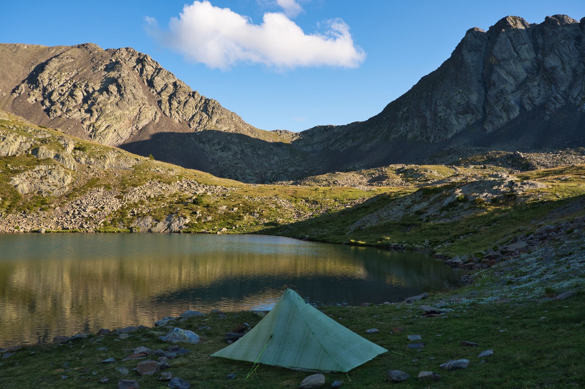 I’d diverted from the main route of the HRP due to a forecast for thunderstorms. The guidebook mentioned great spots to camp near the lake, but a few hikers had already staked their claims by sitting on rucksacks. It soon turned out that there were great spots on the far shore too. The first thunderstorm broke with gusto. Another hiker and I waited for it to pass, sitting there in our waterproofs feeling cold in the sluicing rain, poles left a short distance away. After the fireworks were over, beautiful golden light caressed the mountains.
