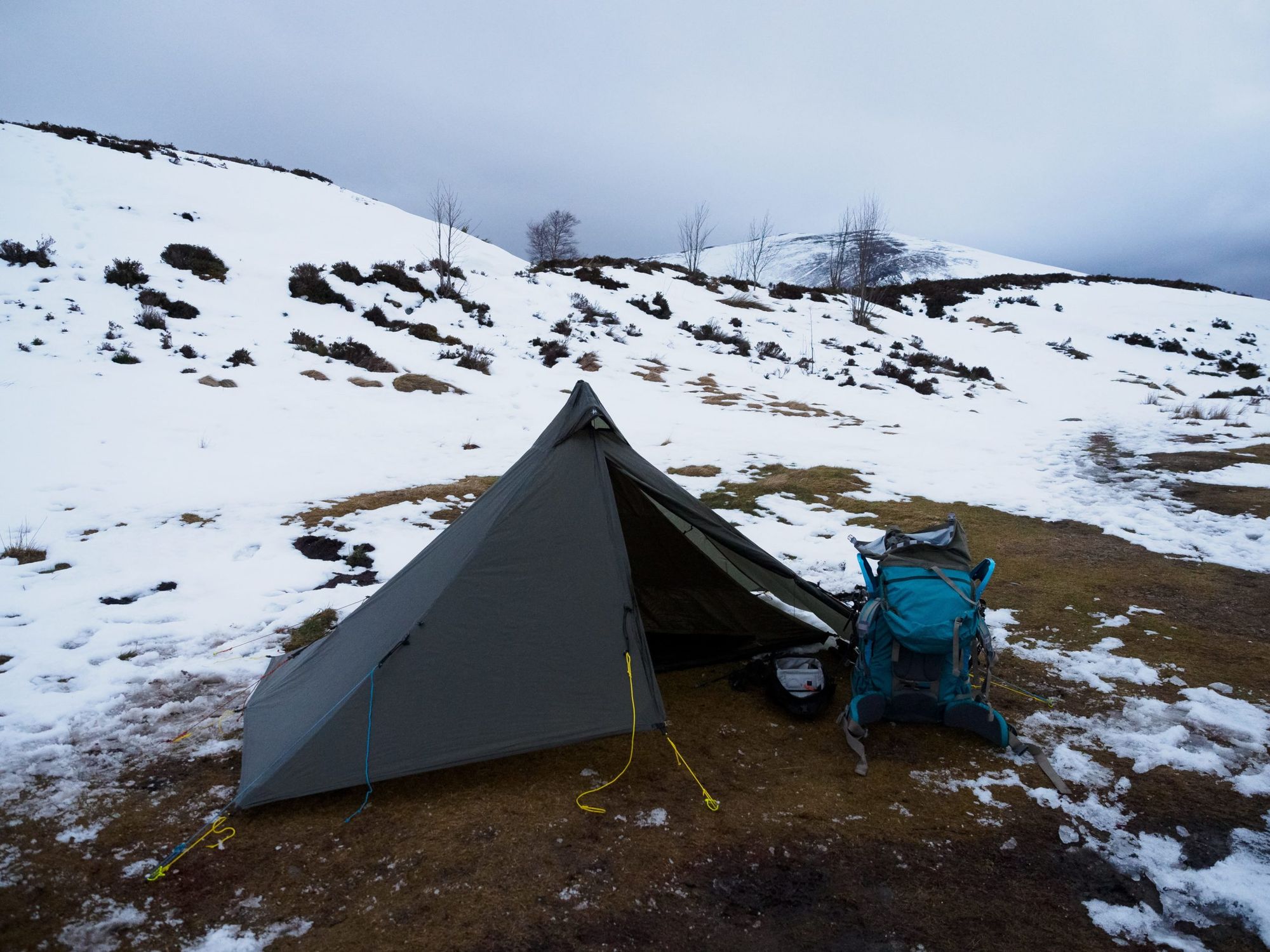 My shelter would have been the Mountain Laurel Designs Duomid (silnylon). This is a shelter I both trust and enjoy using. I carried it on my 2019 winter Cape Wrath Trail and was entirely happy with it. Although I also have a much lighter Solomid, I knew I’d appreciate a roomier and more stormproof shelter on this trip. I’ve recently added a semi-solid inner from Bear Paw Wilderness Designs, and decided to pack this too – it’s great for cutting out cold winds (and midges).