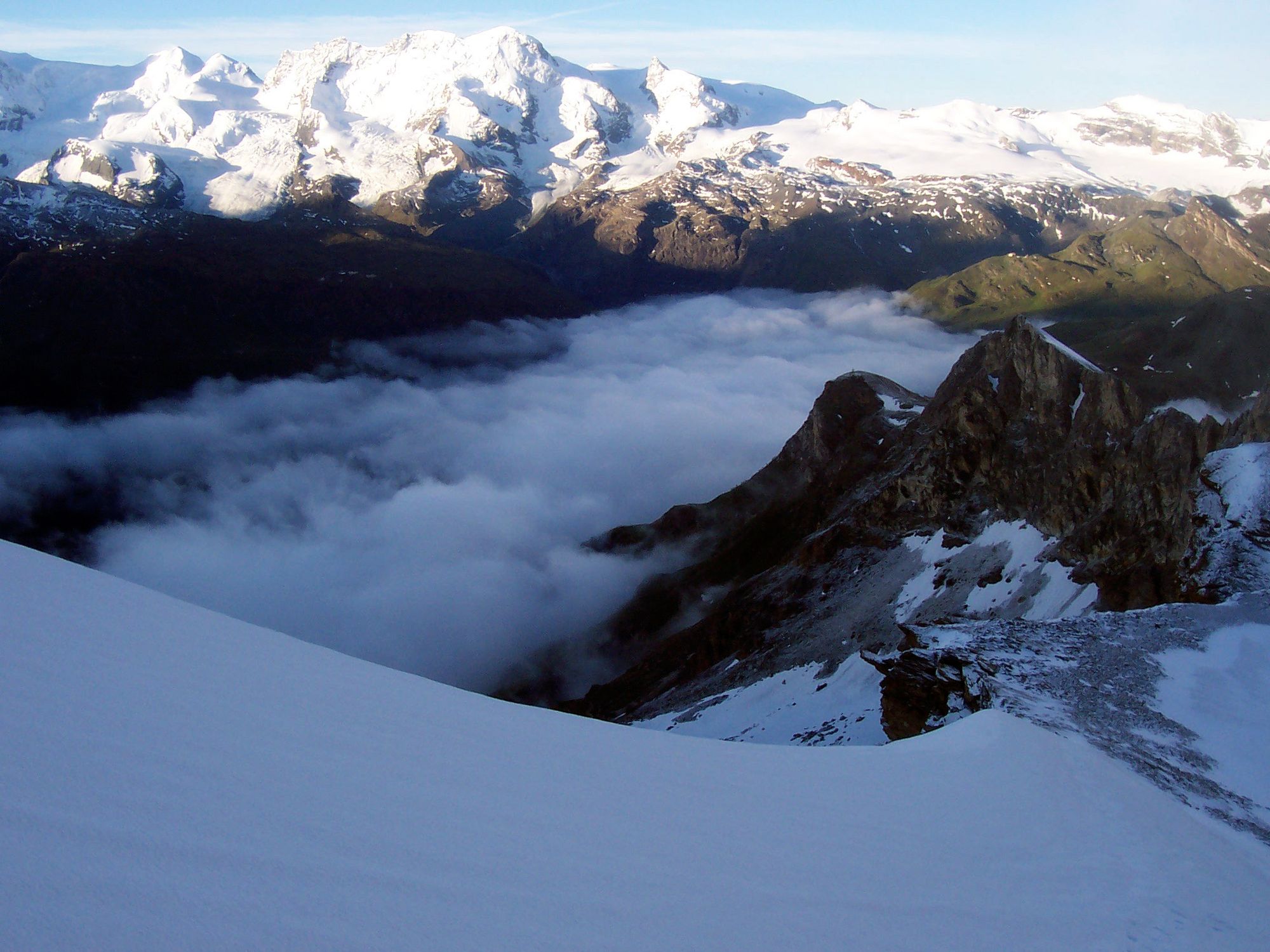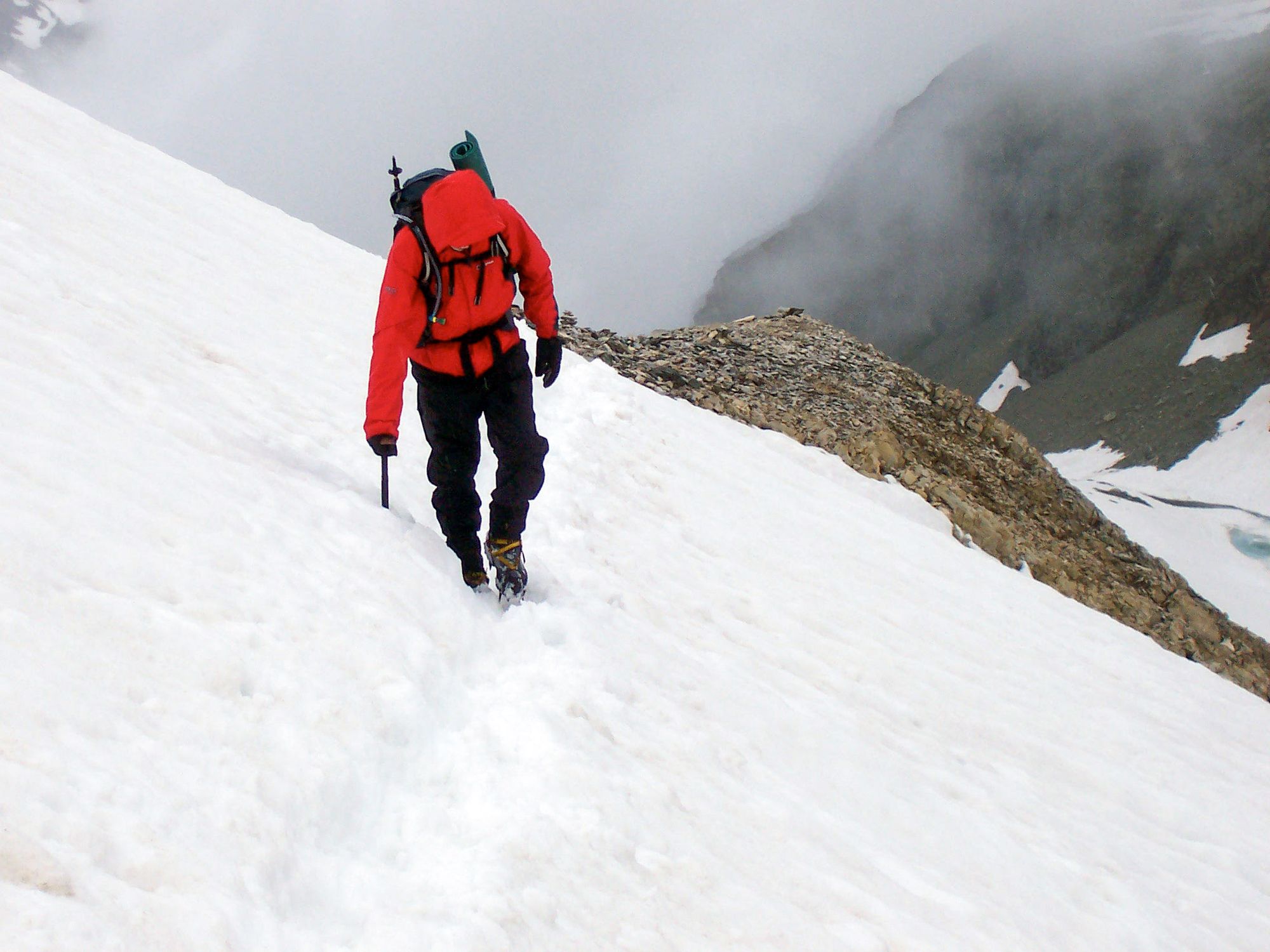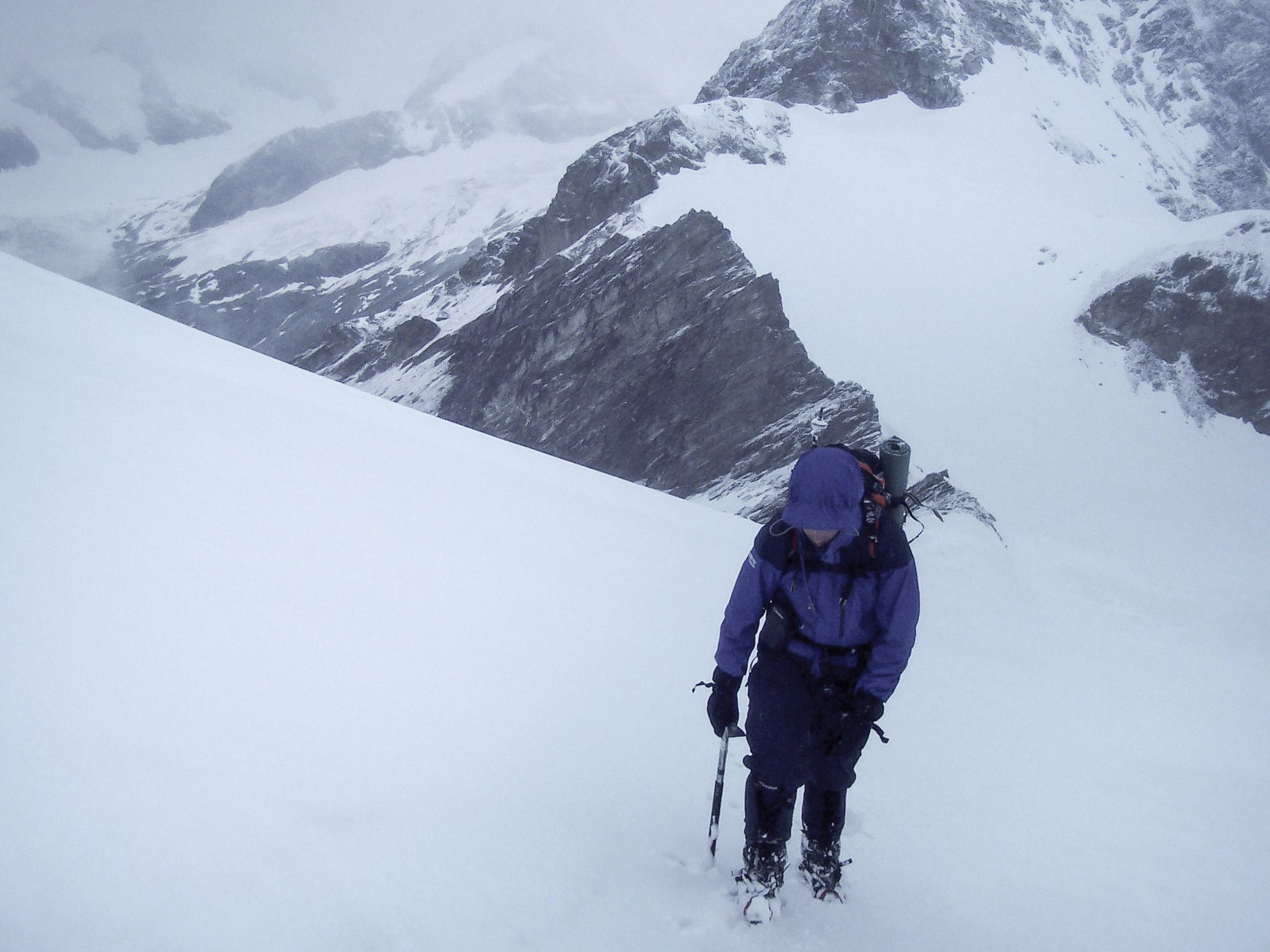 Our first mistake was failing to check snow conditions or look at the weather forecast. Our second was to leave bivvy bags at the campsite to save weight. By the time we’d climbed to the top of the Triftchumme, a rubble-filled gorge overshadowed by the glacier snouts of Zinalrothorn and Ober Gabelhorn, cloud had filled in and a cold wind blew down from the intimidating heights above us. There was far more snow (and at lower elevations) than the “small patch of névé” the guidebook had led us to expect. But we set to work excavating our snow cave anyway, after finding a suitable spot where the snow pack lying on top of the glacier met a ridge of moraine. If you’ve ever tried to dig a snow hole without a shovel, you’ll know that it’s a long, tiring job; we took it in shifts, scraping and hacking with our ice axes. Eventually we hit a 45º slope of rock-hard ice, the glacier itself beneath the snow, and could dig no more. The resulting shelter was hardly a palace, but it was big enough for the two of us and would keep us warm and snug – or so we hoped.