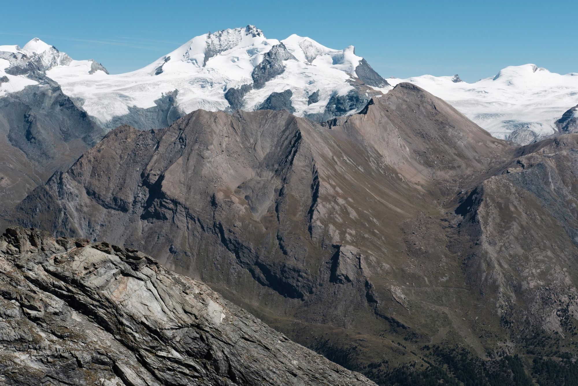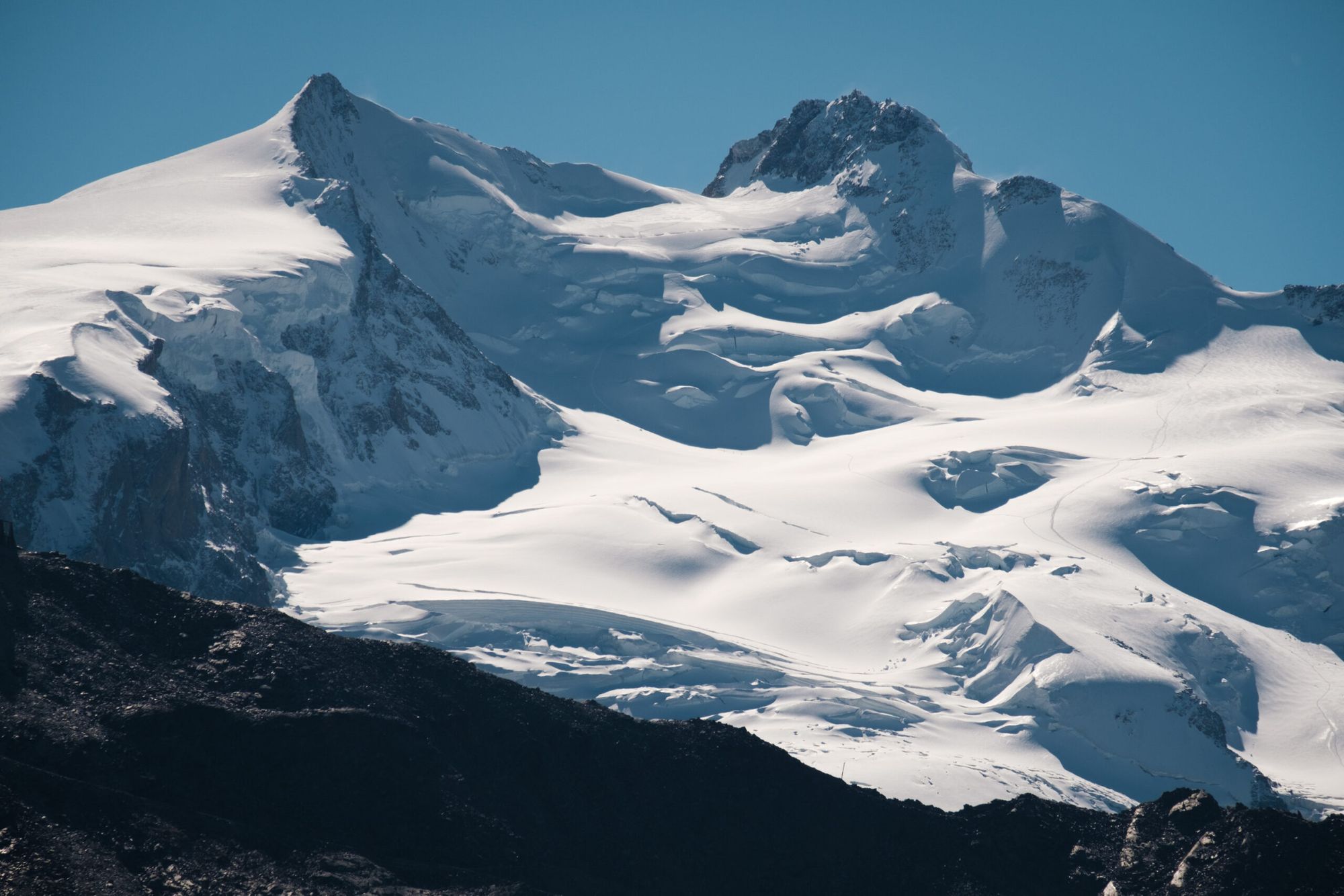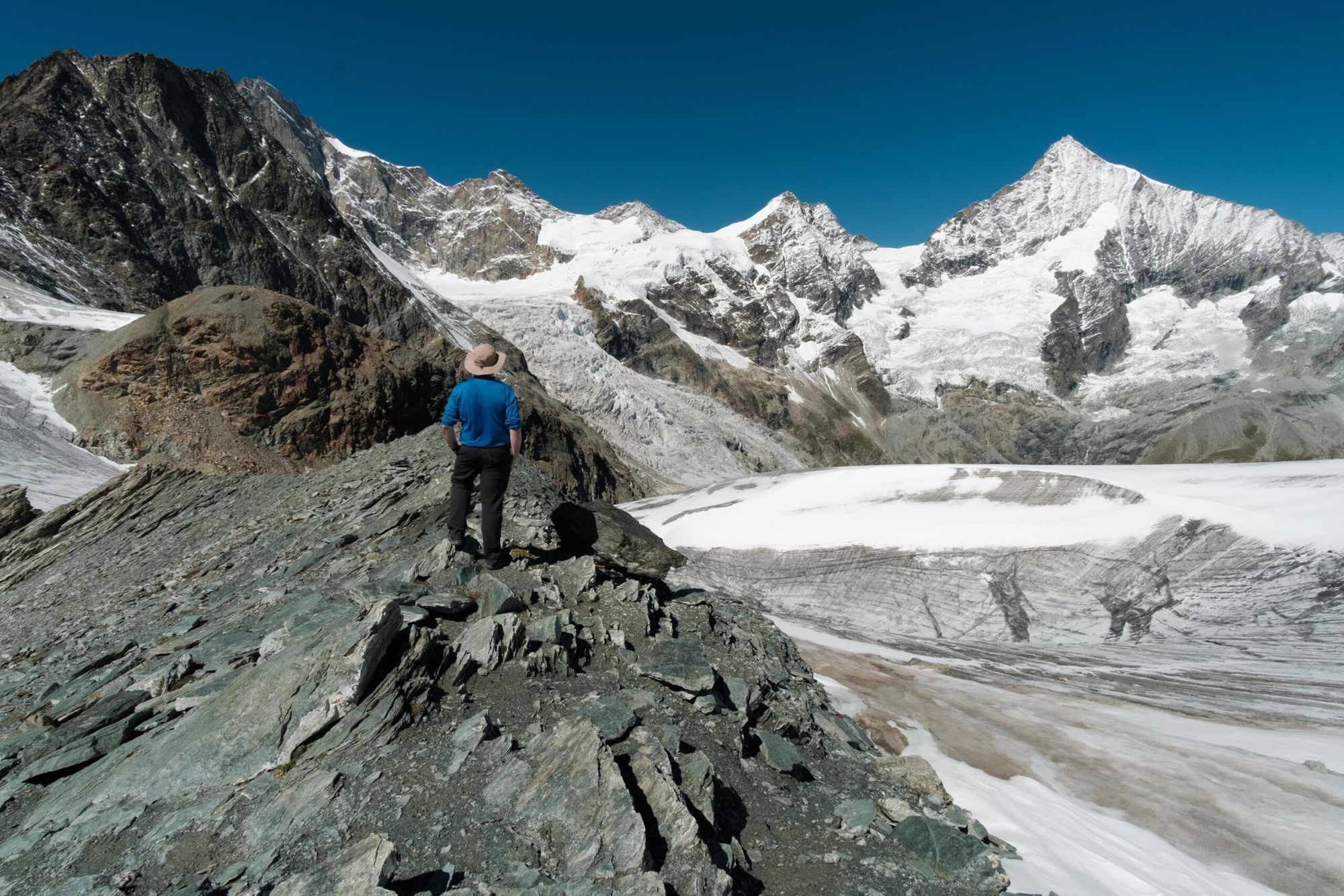 The glacier had changed so much that even the ‘easy’ path over towards Mettelhorn had become a completely different proposition. Where it was once initially flat, with no steep ground anywhere, it had become a bullet-hard slope contouring around Platthorn before flattening out. I stood at the col and tried to visualise my brother and I wading through fresh snow over that landscape towards the summit. But at that moment, with the sun shining on the depleted glaciers and heat rising in waves from bare rocky slopes all around, it could hardly have felt more different.